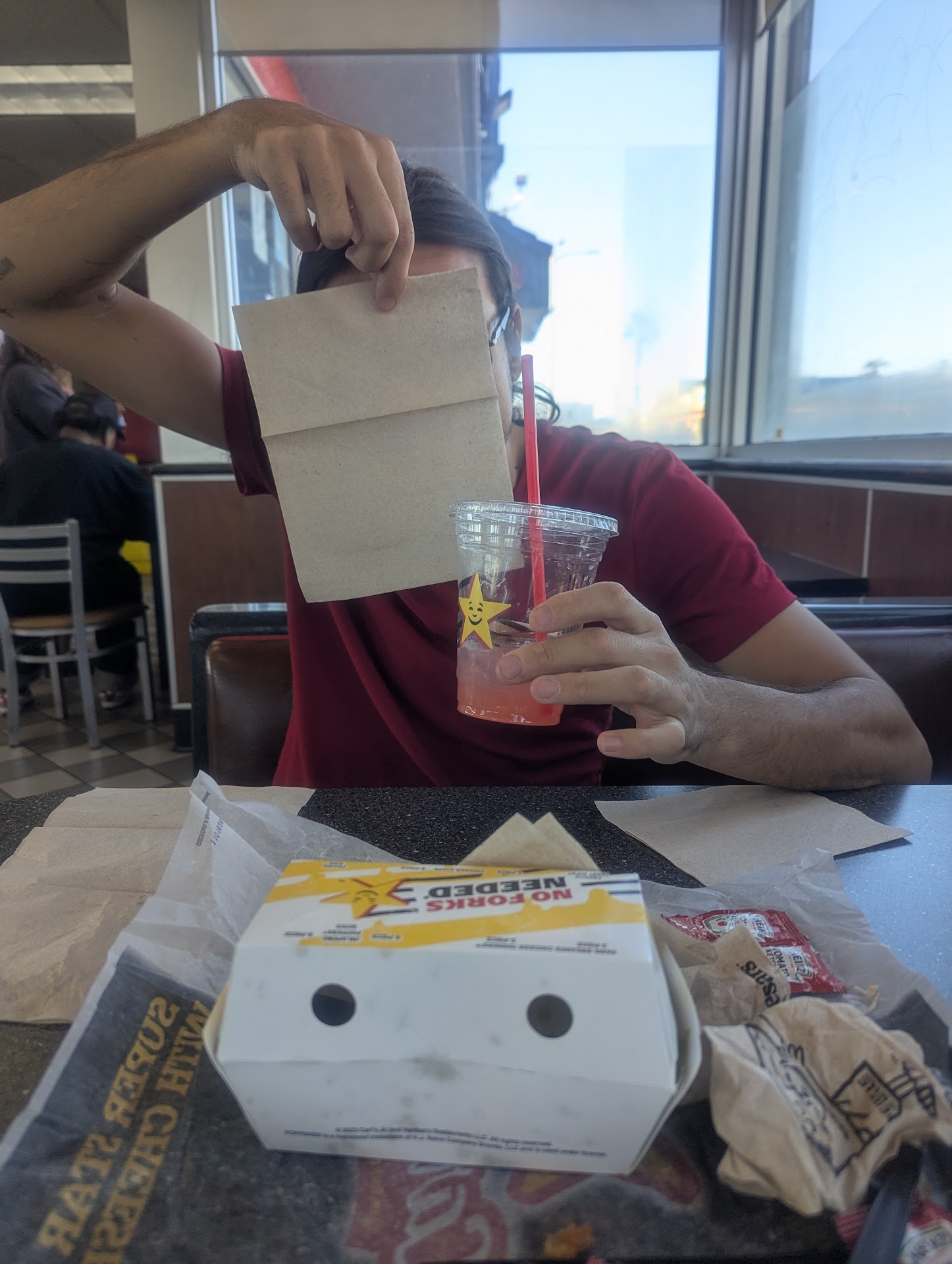 Read moreDo not go here these youngsters. Do t know cistomer service.. I ordered the new r9b birger and it was only a thin piece of something. ?? On the burger and when i took it back they didn't offer any ok...i will make you another...it was just you got what you paid for..this is the only carls jr that treats you this way.. Trust me do not fo here .. Find a different carls jr..m I am personally boycotting this carls jr. Since that. We will make you another it didn't have any cheese... I explaned to the that the got a new manager or owner they will not give you a cup of water to eat woth your meal , even if you are a paying customer.. His excuse was the cost ... Even if you don't drink soda you have to buy one to pour out to use for water from the machine... Even if you have children they still will not give you cups of water for the kids to eat with there meals...but you can buy a cup for $2.50.... Do not go here...
