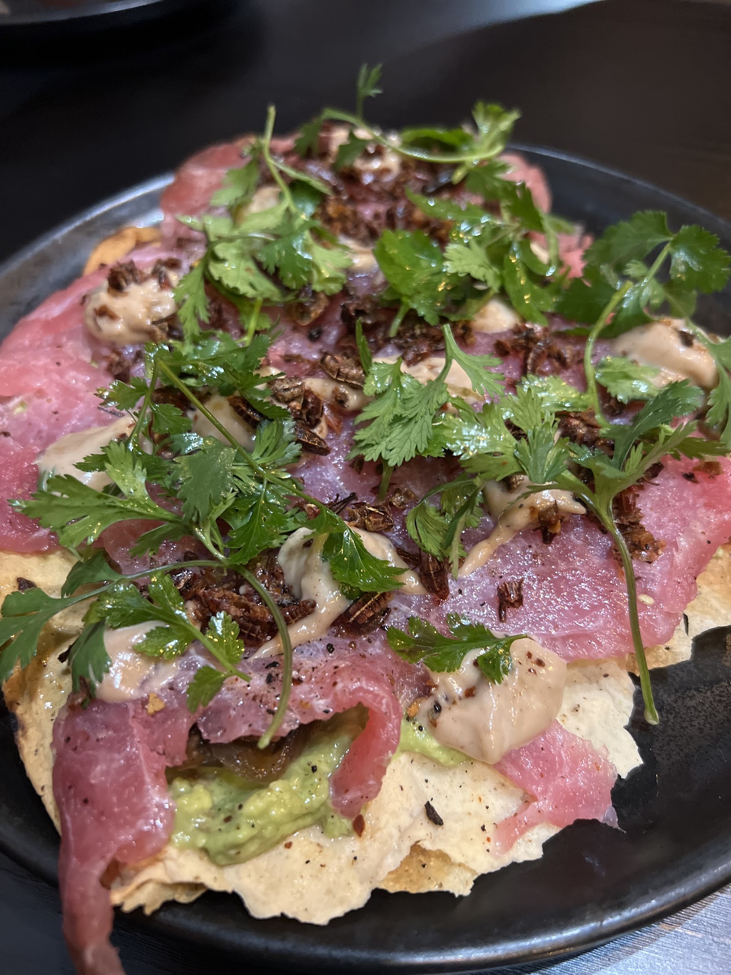 My partner and I just moved into the wonderful city of Highland Park and we’ve been busy exploring all the fine eateries. Gotta say after experiencing Carnal, it is a standout. One of the finest dining experiences we’ve had since coming into town. Outside it’s not much to look at, inside about the same but with spacious ceilings - black. There were some nice accents and had a really good vibe. We were quickly greeted by the host Issac? Really cool and friendly, and we began to explore the menu. It was small but had some select standouts, we decided on the tlayuda, duck in mole, and octopus. They are working on their liquor license but the host encouraged us to pick up our own at the liquor store across the street - flask. No corkage fee. So we did. The Tlayuda came it first, this one like no other that I ever experienced, topped with a generous portion of fresh grade a blue fin tuna, guacamole and savory sauce - on top of a delicious and crunchy tortilla. It was incredible, I loved watching my partner Clara savor every bite. Next was the octopus, the presentation was immaculate, the portion generous, the taste….. perfection, in texture and taste. Last was the duck, perfectly cooked and doused in the most incredible mole, an elegant and very savoy cactus puree was served on the side. The server was very attentive throughout our dining checking in several times, even offered to bring us some of there handmade tortillas, these where not only delicious and an aid in soaking up the mole, they also were visually appealing, really nice texture - make sure to ask for them! All dished are served on these beautiful and traditional ceramic plates which enriches the experience even more. For desert we had a banana brûlée - heaven.