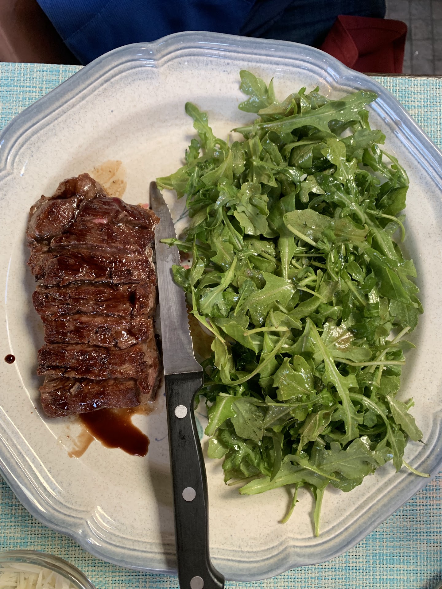 _ New York Steak, Arugula, Shaved goat cheese & 12 year aged balsamic - perfectly cooked, tender, Iâm gonna top my steaks with balsamic at home. Itâs amazing.
