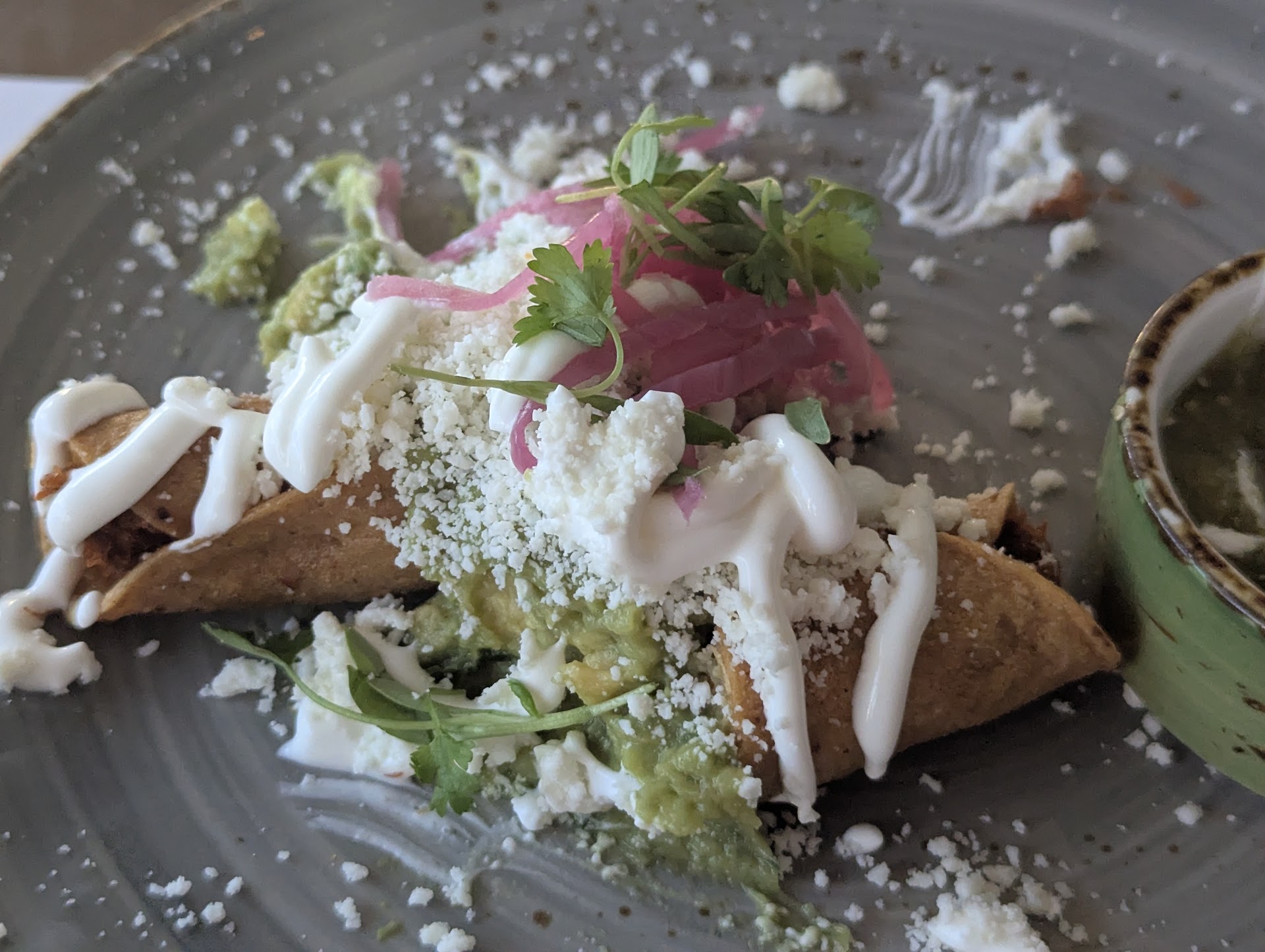 The food was ok. I'm not. Huge fan of Mexican food so I really can't judge. My husband enjoyed it and said it was good for "fancy" Mexican food. One thing I will say is they get 5 stars for the drinks. Creative and tasty. The selection of salsas on the menu for $6 is misleading. When you order it, the server will say "oh the tower?" and you will say yes. Just know that the price on that tower is $19. Tower equals the bag of chips and the quacamole plus 5 bowls of salsa you see on everyone's table. Just the 5 salsas are 6 bucks. We also ordered the flaming panels (cheese) - good, the fish tacos ‐good...you get two, the lobster rice with coconut and lime- good and not covered in onions thankfully but borderline salty, and the hubs had the large plate Carne asada with a side of tortillas. He made his own tacos and enjoyed it though he looked like he had a tough time with the meat. He still liked it. Dessert was the butter cake with strawberries. It was that or churos with a caramel dipping sauce.