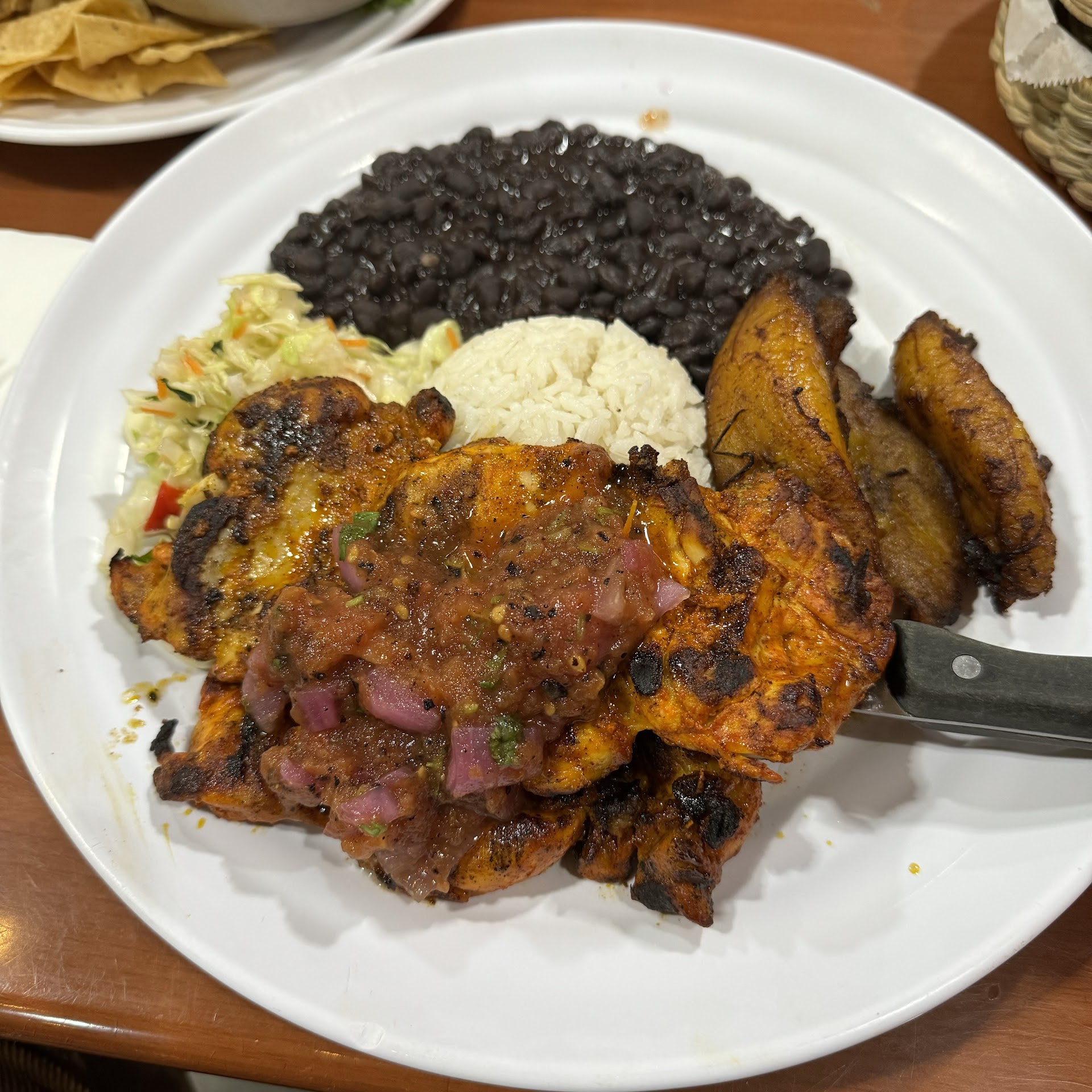 I ordered the Pollo Asado, a flavorful boneless chicken grilled over mesquite charcoal and marinated with achiote and sour orange juice. It came with perfectly cooked fried plantains (crispy on the outside, soft and sweet inside—so good!), roasted red onions, rice, and black beans. My friend chose the Cochinita Pibil, which was tender, juicy pork marinated in achiote and sour orange juice, cooked in banana leaves, and topped with pickled red onions. It came with rice, black beans, and warm tortillas.