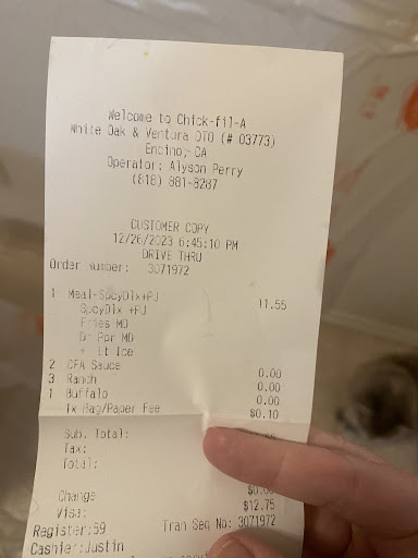Read moreIf youâve been to this location you know the logistics. I place my order at the drive through and am one car behind the window where they hand you the food. The lady in front of me apparently has some promotion but needs to download and app to do it. 5 minutes go by and I grab the attention of the employee standing outside the window handing food to the cars and I ask him hey man I just got a chicken sandwich and I need to be somewhere can this lady come you over to the right and finish this or pull to the left so I can get my sandwich and go. He respond to me in a rude tone âNo! you need to stay right there.â Free more minutes to by while there is at least 10 cars behind me and he is still helping this lady download the app. I asked again hey man well what if I donât want my my sandwich and just need to go. He begins to tell me well youâre stuck nowâ clearly the lane was wide enough for her to pull to the right or left and finish what she was doing. By this time I believe a manager in blue shirt comes out and instructs this employee to hand us our food. I ask so what now he goes you should back up and go around. I had to squeeze through a tight space. To get around. This is fast food isnât the philosophy turn and burn? Or is the lady getting free items worth holding to the 10+ customers behind? Expectations arnt very high but he could have just spoken to me in the same respectable manner I...
