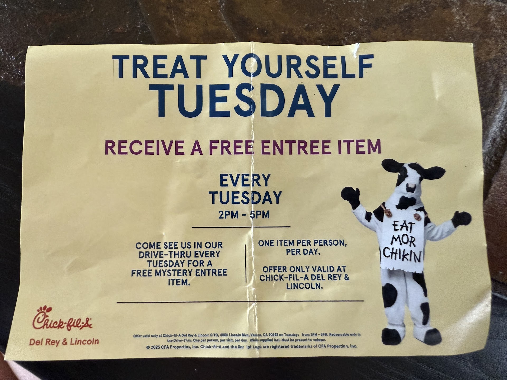 Read moreMy neighborhood Chick-fil-A gave me this coupon in person to use on any Tuesday 2-5 for a free mystery entree item when going through the drive through for a future purpose - one per person and no purchase necessary. I went today to use it and the team member Carsyn told me they wouldn’t accept it and that they PURPOSELY do not put an expiration date to get customers to come back.
