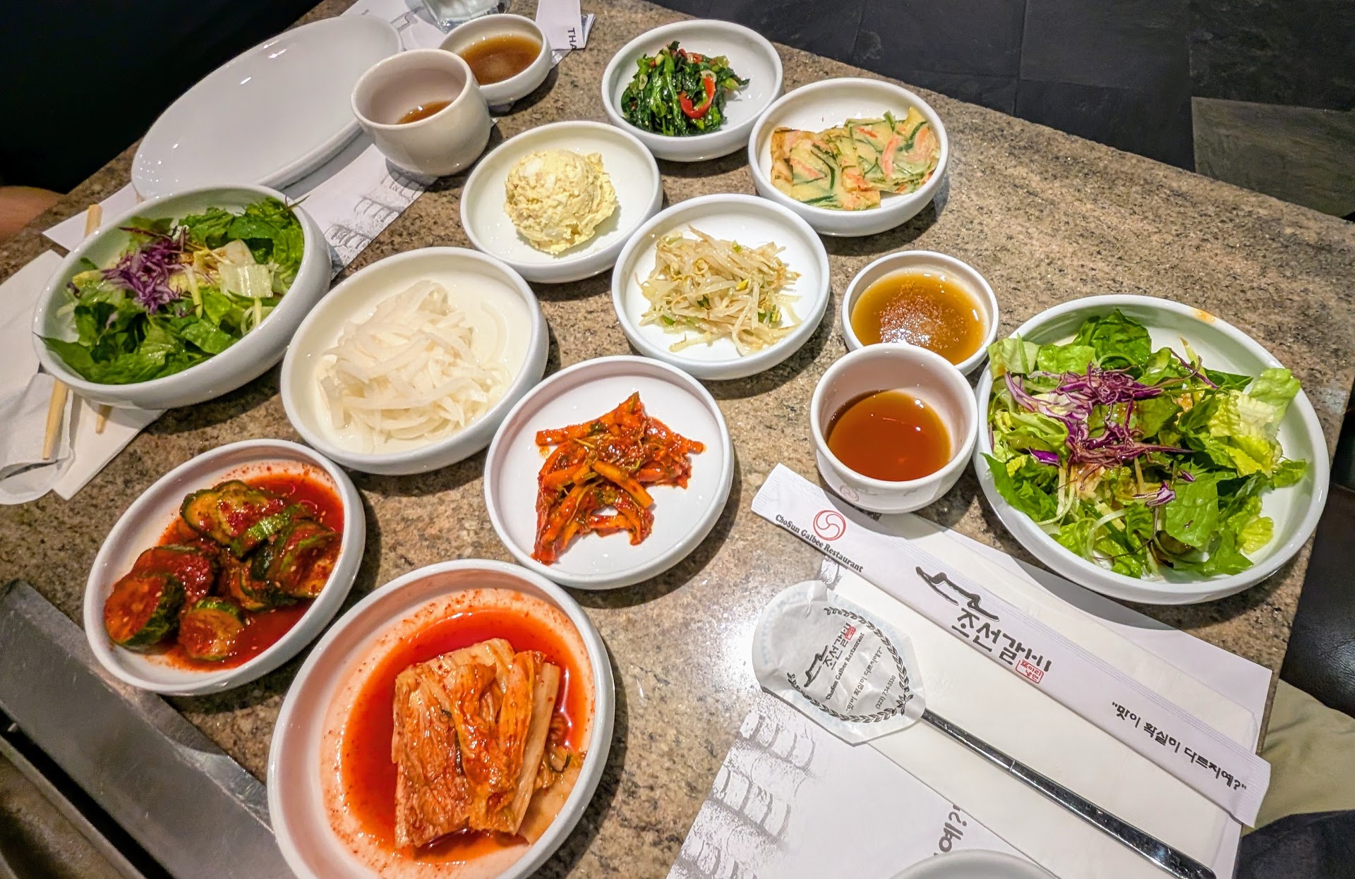 We waited about 10 minutes for a table. 8 different banchan was immediately served. All the banchan was tasty, especially the green beans and cucumber. Unlimited salad to go with the BBQ meat. I like the addition of green onion to the salad.