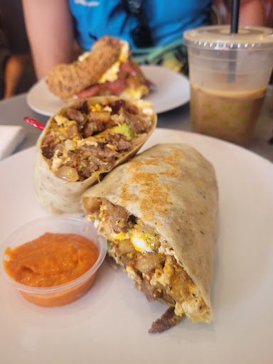 Read moreGot salted caramel latte and breakfast burrito. The food was served very quickly. Had a huge portion with a generous amount of avocado and veggies. The bacon or the meat they put it in was perfectly seasoned, not too salty or bland. Great service; very friendly barista. Sort of an open kitchen. All of the kitchenware looks clean and dust free. There are a lot of power outlets near the table so if you are running out of battery and need to charge your phone or need a brief break, definitely would recommend. I would not really recommend studying here (even though they have a great choice of music), because of the small table size as expected in LA. There is a lot of traffic too, since people are grabbing drinks by the front table. Will be coming back...