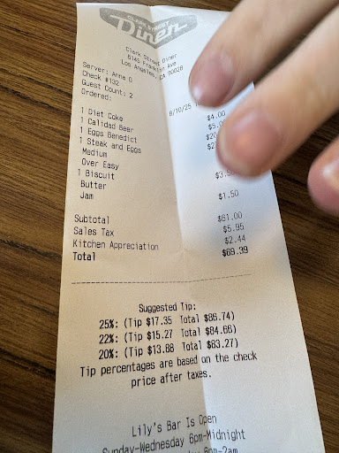 In LA, minimum wage is now $21.01 for hotel workers (this is a hotel restaurant) so all this seems a bit pushy to me. Breakfast for two, one beverage each, was $69.39 with tax and kitchen tip before tipping the server.