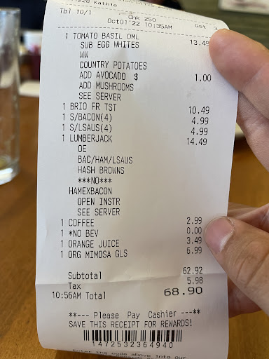 Read moreSo I dont like to play the race card but idk what it could be.Ive been here 5 times because I like the food alot .Out of those 5 times there was this white waitress.She welcomed me but looked mad at me idk why so I just did as she said and went about my day with it.She would mutter under her breath when I took too long to order and i decided to bring my gf here to see if it was just me.She noticed it too and we noticed she would hurry us to do things like order and choose menu items and when I tried to change little bits of my order she just straight up said no.(I wanted french toast instead of pancakes).Idk it was redeemed with the other waiters one was a guy and the other was a woman named kim.Very sweet people.Anyway maybe figure that out because it seems like its not only me who thinks this.I saw another couple peoples reviews and surprise,surprise they weren’t white where the waitress was rude or just straight up trying to get you out. What also gets me is that she subbed some of my food and charged me normally as if i had a choice in it and i didn’t realize it until the check.Oh and she was really mean when i tried to ask for pie?Idk man it was uncomfortable but i really wanted to say it was a bad day but every time I’m there on 5 separate occasions?I...