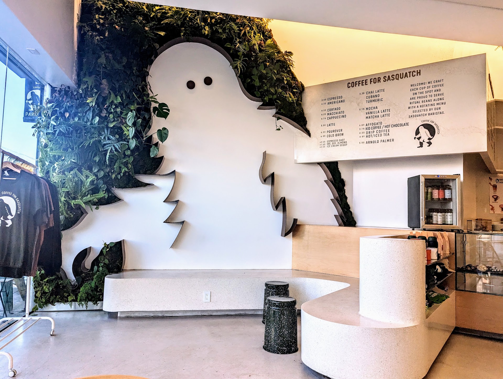 If you’ve adventured around the Hollywood area, you’d probably know that the Melrose/Fairfax and Hancock Park areas are home to an abundance of boutique style shops and café style restaurants. Smack dab in the middle of all of the excitement lies a cozy shop called Coffee For Sasquatch, so cozy that you could easily miss it unless you were actively looking for it. But when you finally step inside, you are not only greeted by the wonderful smell of freshly roasted coffee, but also welcomed by Sasquatch himself – well, a living plant wall of the hairy legend. Beautiful green plants give the shop a lovely contrast against its white, tan, and marbled interior while modern furniture designs is the whipped cream on top of the clean, sharp, visually appealing latte. The shop is perfectly laid out for reserved solo visitors and intimate conversations, but larger parties (4+) should consider arriving earlier or in the late afternoon as its popularity can make it difficult to find seating to suit your needs.