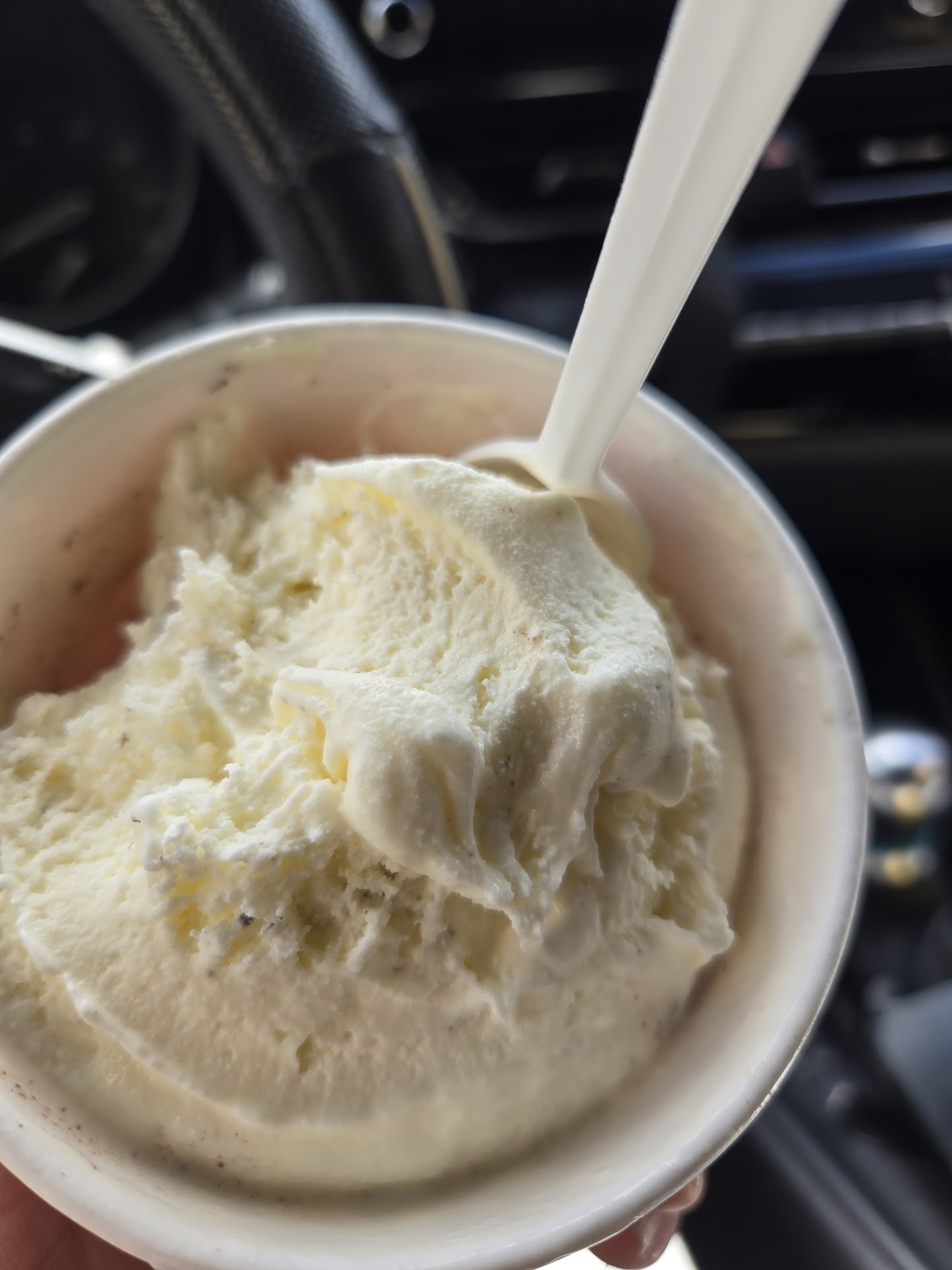 We were celebrating some good news today, so I wanted to treat the family to some ice cream. I placed an order ahead of time at about 2:40pm and scheduled it to be picked up at 5:45pm. I ordered a quart of ice cream with some mix-ins. When I got there, I was asked if I was ready and helped promptly. I told them I was picking up an order of ice cream and told them my name. There was a small compact - what I assume is a freezer - right behind the counter. The representative opened it and pulled out a bag with my name on it and handed it to me.
