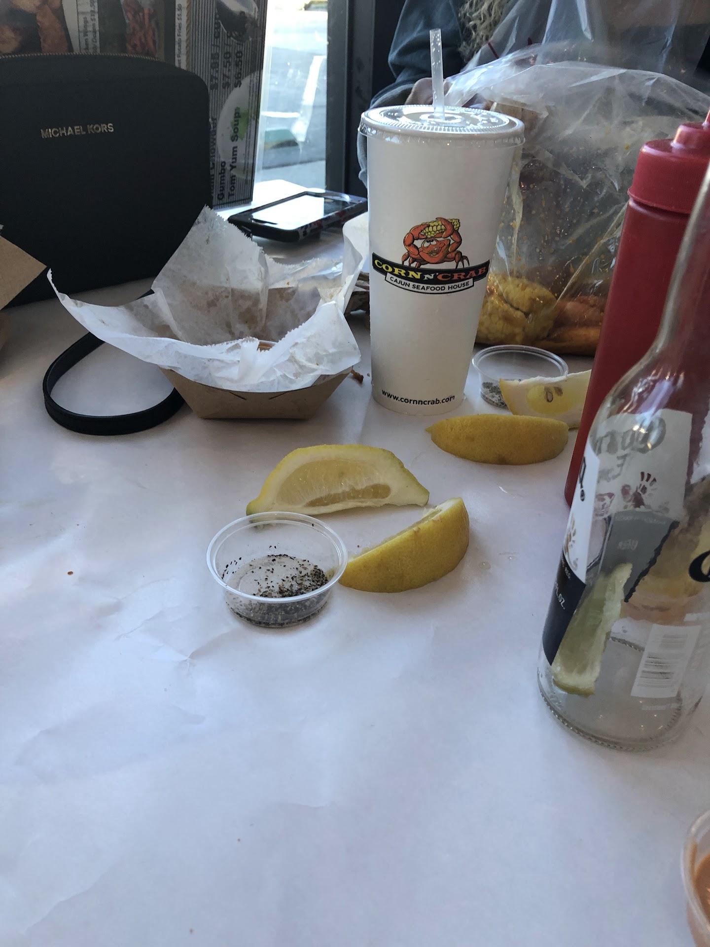 cons : long wait no seating area small not enough tables no one greeted us after 30 minutes .. pros: good food tasty hot free refill on drinks cold beer , water give you dish sauce can’t request more fresh lemons salt/pepper in small plastic cups and bibs for bags of seafood on a plastic table cloth only waited like 15-20 minutes for our food .. would I go again yes because the food is worth it it was a holiday so I looked past the wait and remained patient...