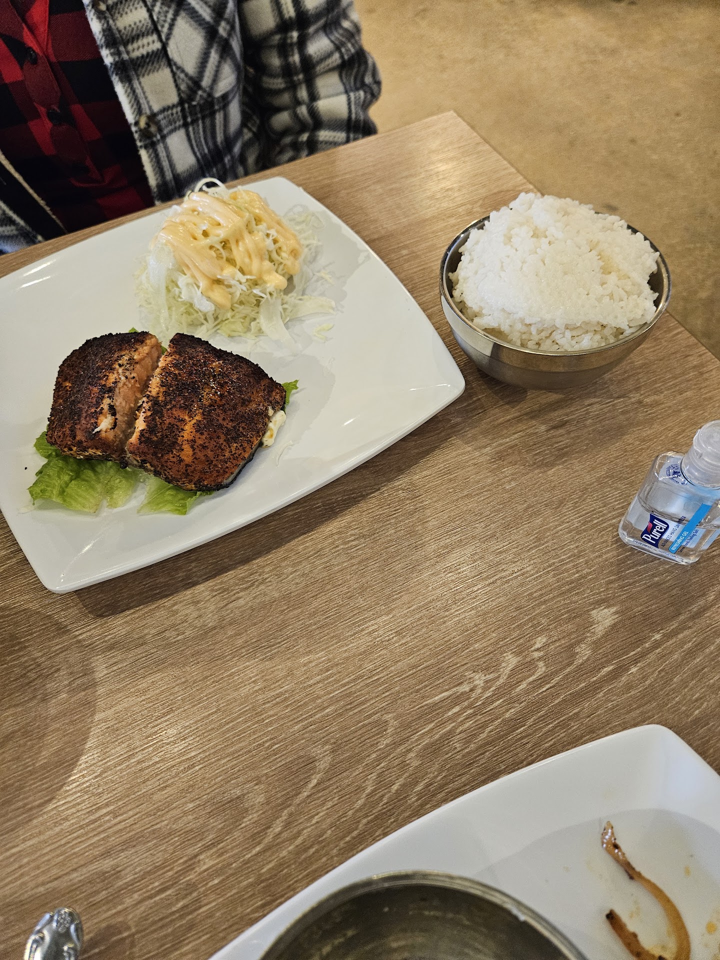 If you're looking for a new place to try out then I would recommend trying out this place if you're in the area. I heard good thing about their burgers so I would recommend that over everything else. When I came here, I got the Korean BBQ beef plate at medium spicy where it comes with rice and salad. My wife got their grilled salmon and they will make you aware that it takes about 15 minutes to make. We decided to eat at the restaurant so we found a table inside. My salad came out first and you can never go wrong with a salad. Then my beef plate came out and I thought the beef was just okay. It wasn't spicy but I felt it didn't have much favor either so that's why I said it was just okay. The rice was a little too mushy so it wasn't my favorite. My wife grilled salmon did take about 15 minutes and when I saw it, I thought it would taste dried. I was right because when my wife started eating it, she said it was dried and didn't have too much flavor. I tried it myself and agree with her so I wouldn't recommend getting that here. The customer service here is great and they also have a outside patio. They also clean up your plate for you after you...