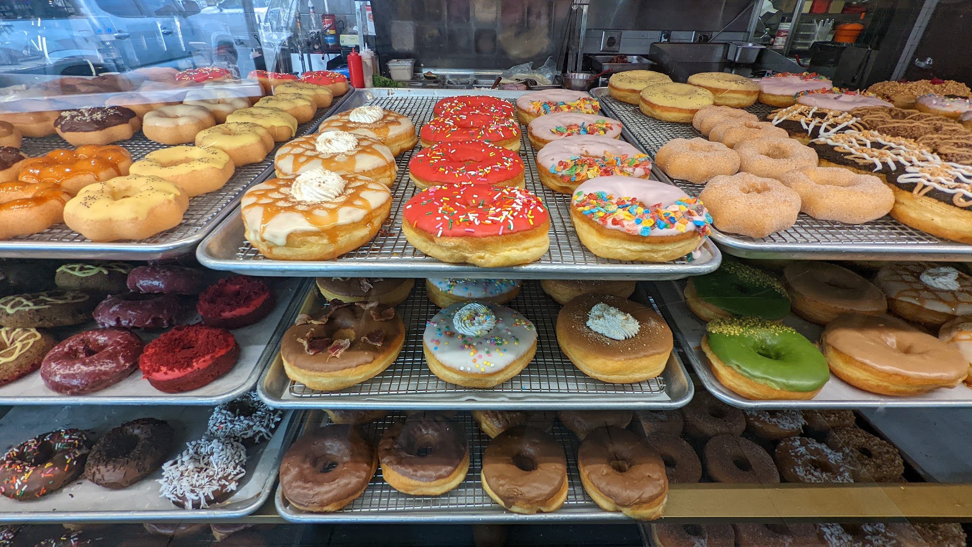 Previous Review: I Adore the #14, bagel with cream cheese and tomato, lettuce, onions (surprisingly), with salt and pepper. โก The Donuts are Yum too...so far only tried the chocolate glazed. Btw, the Cinnamon Roll [Donut] is $3, instead of $2 (that is displayed on the photographed menu). Outlets and Bathrooms with Toilet Seat Covers. Beware of the smoked that take time to smoke, they may get mad if you leave your table unattended for some time, Regardless if you are digesting or taking a break to enjoy more. Also, something happened with the bathroom code one day. They were giving one that wasn't working to a customer near me (Woman, African Likely [Perhaps]), so I happened to tell Her the code that I knew! Sucks to be a women trying to get into a locked bathroom Immediately. Why wait longer? Though, Remember the days with Lady Rooms with Lines?. โ At Least We can wash our Hands before we eat at this Establishment. โ Big Plus! โก Thanks, Delicious. Always Enjoy it. โกโก