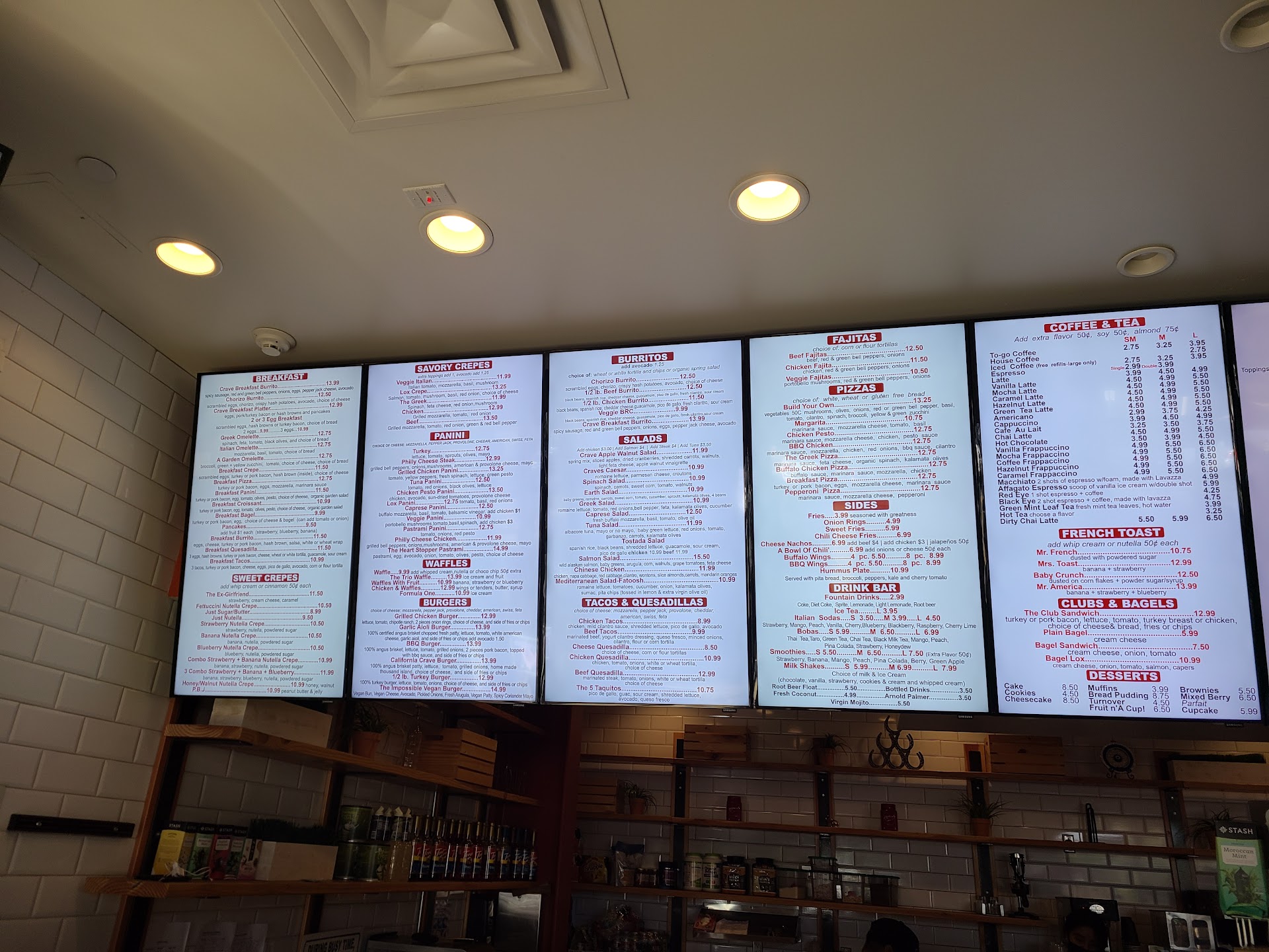 Fast Food, poorly made, terrible service. I believe this location had different owners prior to , during and shortly after covid lockdown and that was when we made our first visit, checked out the menu, was not impressed and went elsewhere, The Business name remained the same, but the interior is different for this second chance visit in December 2022. The new interior was nice but I noticed and unclean floor and tables and drip buckets next to the roll up window feature. Sad to see, structural design in question SCARY...it might fall on customers! We walked up to the order station to look overhead (Fast Food Style), and a new expansive menu...Great idea for masterful, 'accomplished restaurants', questionable for new businesses, as it appears they are trying to capture every age group and food style. This was a proven fact when our order arrived. My friend ordered a bagel, lox and cream cheese which fell apart on first bite as IT WAS NOT A BAGEL...but bread dough baked in a circle with a hole! Purchase properly or Leave that expertise to a deli!! My friend complained and they supposedly remade the order, but It was the same fall apart bread base only an addition of grill marks on it. TRASH! I ordered the fruit covered waffle. The presentation looked good, but the waffle was too sweet...AH, another short cut...Cake mix was used instead of the proper waffle/pancake mix and it fell apart upon biting also. The place was empty, service was slow, and the servers were slow and unintelligent to have a conversation with. Terrible music was blaring at an incomprehensible level making it unable for patrons to engage in conversation. Low Grade, Short cut fast food for those who do not know any better especially for the price gouging they are...