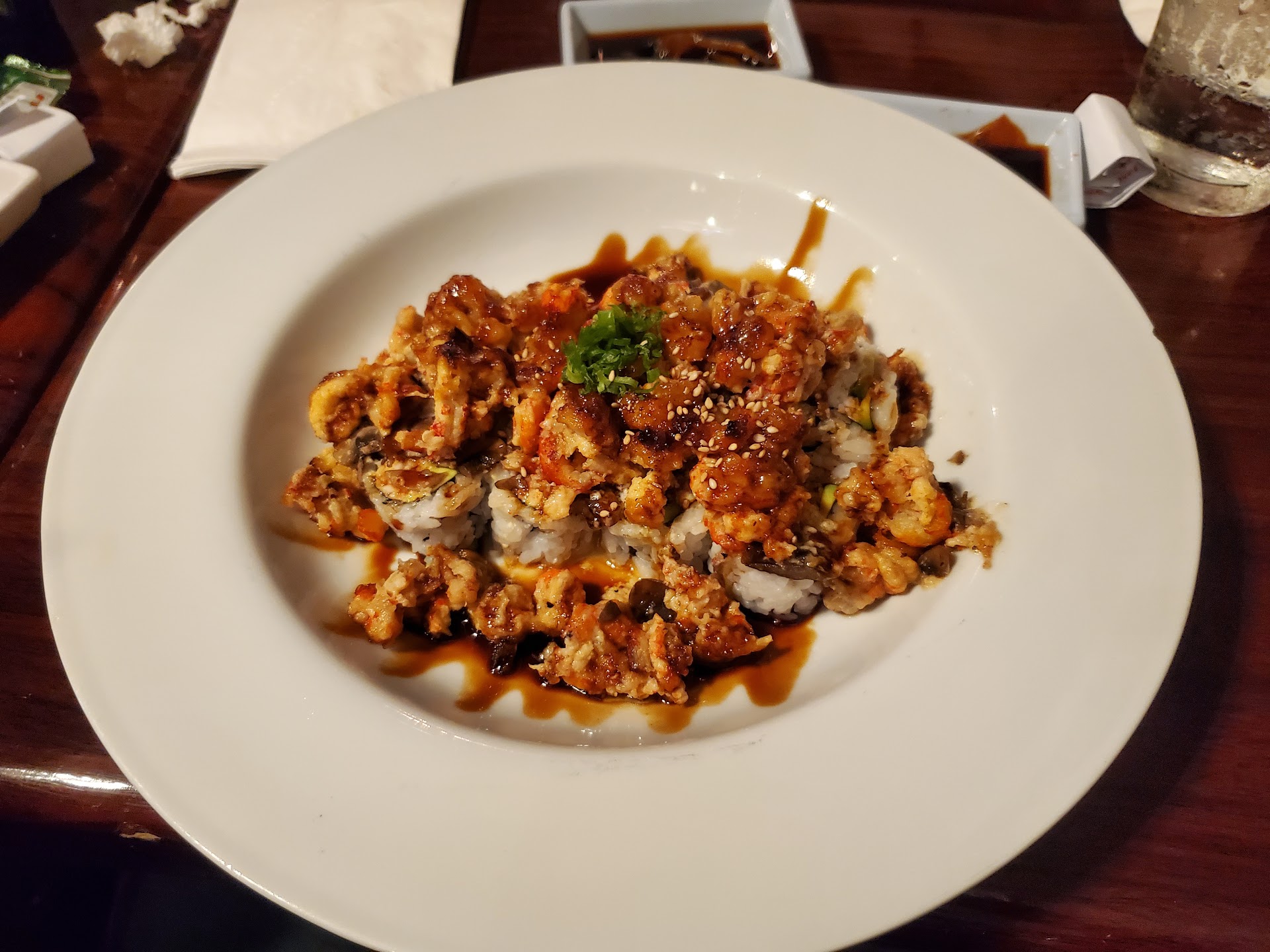 I always pass this place and I decided to invite my girls to try it out with me. We were all so glad we did. We ordered a number of items which included the following: white peach Nigori, strawberry Nigori, plum wine, garlic edamame, garlic butter shrimp, salmon skin salad, rainbow roll, candy cane roll, Alaska roll, Red dragon Roll, baked lobster hand roll, summer roll, and of course the crave roll. Everything was soooo delicious!!! I’m mad I didn’t try this place out sooner. And to top it all off, they stay open til midnight on weekdays and 1am on weekends. They even have a connecting location Crave Cafe which serves more food which includes waffles, coffee, burritos and more! I can’t wait to try that restaurant side out and it also stays open late.