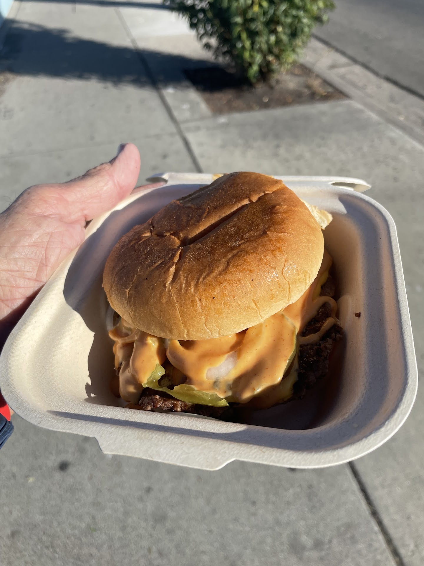 Been meaning to stop and try because it looks like it could be good. As I approach it smells good and when I see the prices I'm definitely interested to find out if it's good because I love a good smash burger as a fan of several joints around town from Hi-Ho to Win~dow to For the Win to Heavy Handed just to name a few. I ordered online for pickup but when I got there, even though the money had been taken from my account by the 3rd party facilitator, the truck hadn't received my order. Despite that, the vendor believed me and made my order without hesitation. I love grilled onions with my smash and unfortunately they only had raw. In the end, I didn't really miss them because as it stands, it's quite a decent version with well seasoned meat, good cheese and a soft bun. I devoured it in 2 minutes and was very satisfied and for the money, it's hard to beat. Especially the 2 for $8 deal. No complaints; great...
