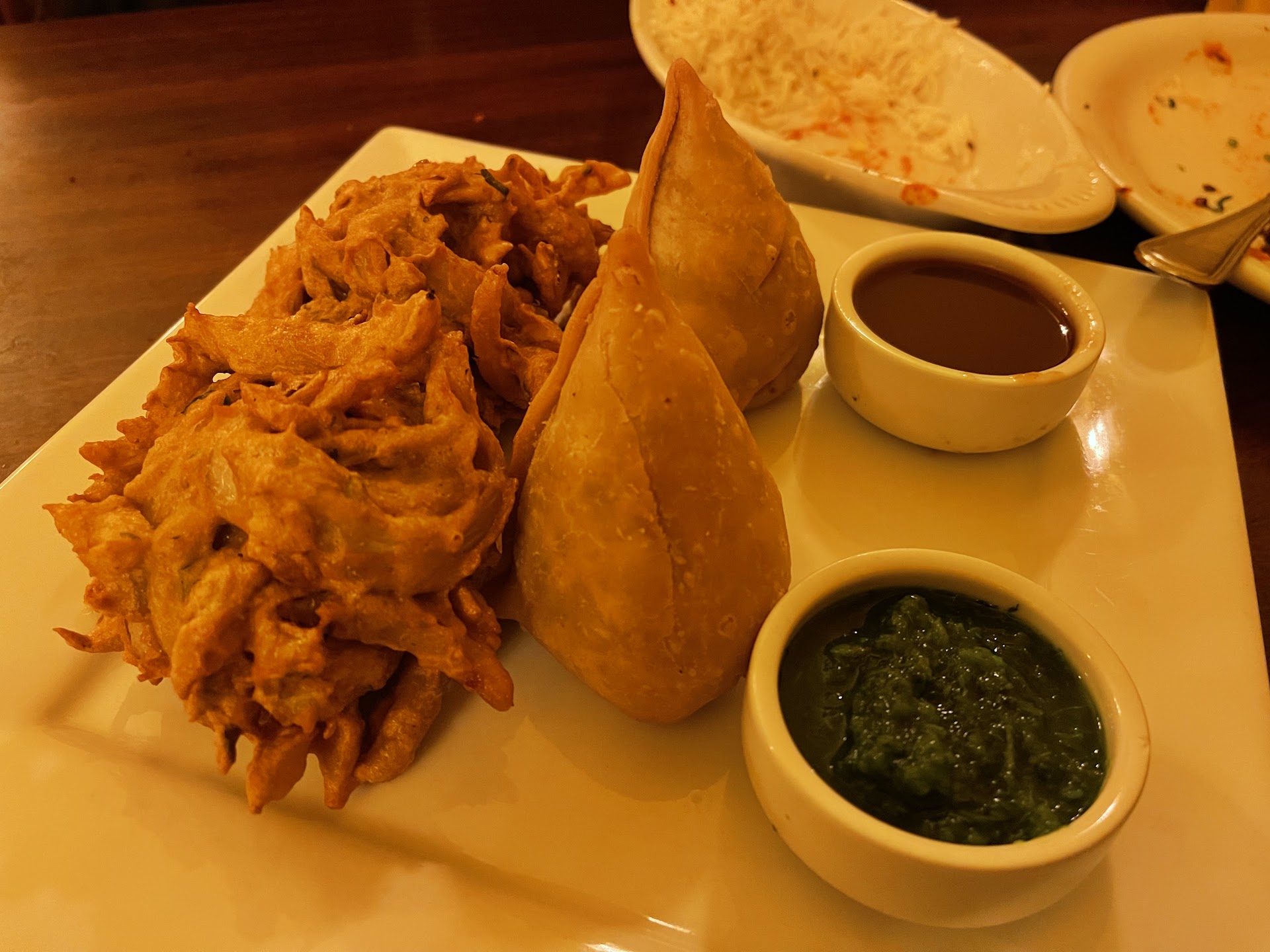 We walked in & were immediately seated by Maruf. We already had a game plan of what we wanted. Veggie samosa, tandoori chicken wings (two orders this time!), & garlic naan bread. The first time we ate here we tried the chicken tikka masala & it was delicious! We had to try something else & this time we ordered the Vindaloo chicken because we love spice! We were served onion bhaji somewhat like an onion ring with our veggie samosa. The wings are unbelievably flavorful, some of the best chicken wings that have ever blessed my taste buds. Everything is actually full of flavor. This place is a must try! We topped off the evening with the mango kulfi, what I describe as a perfect little mango ice cream to end the glorious night. Amazing family & service, thank you Maruf!