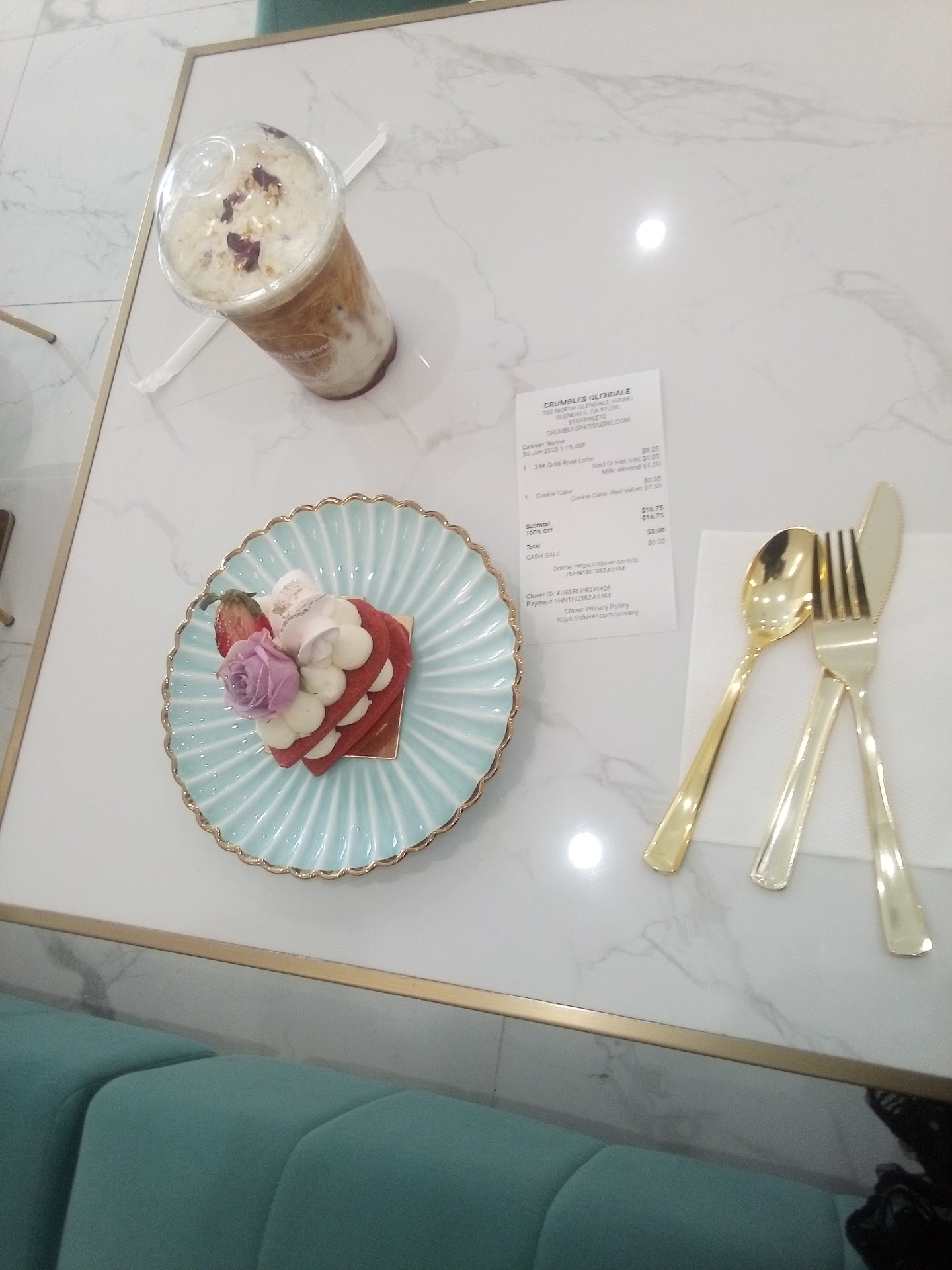 This American cafe and dessert shop "Crumbles Patisserie" is a successful idea to cater 24k gold ingredients to the American cuisine. The staff is professional, sleek, clean and welcoming! The selection of desserts reminds guests of roses being healthy to anyone's lifestyle. It's time to think of roses and flowers to add vitamin to people's health. Their flower latte selection is exquisite and we are glad to have you here incorporated. Crumbles Patisserie gave me complimentary heart- shaped -purple -rose -24k gold cookie and a iced 24k gold rose latte. They place the pastries in fine porcelain dining ware. The setting has a glass chandelier that is for those with a luxury living sense of style, the fashion term "simplicity is the best" is on-rolling basis here for those with a modern aesthetic. Crumbles Patisserie has small cafe- style seating with pop music in the background giving the option for students and professionals to work and study.