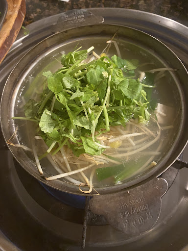 First came all the sides including the banchan, steamed eggs, veggies pancakes, scallops. Everything tasted good. I liked the scallops. Then came the monkfish sashimi. That was fresh. Monkfish sashimi has more of red snapper feel in my opinion. Then came the fried monkfish whole. That was very tasty and crispy. Fried monkfish (in fish and chip style) served with sweet and sour sauce. The sauce was a bit too sour for me. Monkfish stir fried with bean sprouts. I wasn't a fan of this dish. Just way too much bean sprouts and this weird tasting round thing that tasted like medicine. Last was the soup which we opted upgrading to the puffer fish soup. They cook the soup at the table. That was good too not too fishy. We were running a bit late for the comedy show so we asked for the check. Which we learned the final final dish is fried rice. They use the remainder of the soup, add purple rice, seaweed and sesame oil and cook it at the table. That was good too but we were full and in a hurry so we took most of the rice togo.