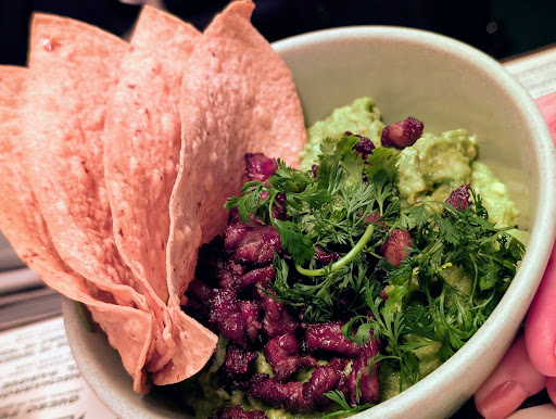 A great and very creative Chef driven experience. Small menu offering but packed with great shareable options. We ate the obligatory Queso Fundido. I can't say that it differentiated itself in any way from any other well made one, but it was solid. Good blend of cheeses that stayed melted even as it cooled, served with warm whole wheat flour tortillas and topped with pico and salsa macha. There was chorizo as well that was not notable or memorable but it did leave it's trademark red fat pool. I ate an octopus taco. The octopus was perfectly tender and delicious but it was drowning in pineapple salsa. The salsa was delicious but it was too much. There was one small-ish tentacle about the size of a fat thumb, but I could barely taste it because of the salsa. The salsa was spicy- tasted like it was roasted or grilled and infused with some hot chilies. Nice acidity. It really needed twice as much octopus and half as much salsa to work. More char on the tentacle. Finally we shared what was ostensibly guacamole but without the seasoning ingredients, with the addition of rib eye carne asada for an upcharge. It's billed as mashed avocado which is what it is, the avocado was perfectly ripe and it was well seasoned with salt and lime but I felt myself wanting the rest of the ingredients that comprise guac. Onions, chilies, cilantro, tomato etc. The grilled rib eye was disappointing. Taco trucks cook the chopped meat on a hot flat top until it's crispy and dried out, that's fine for inexpensive meat but not rib eye. I really hoped it'd be a thin rib eye steak grilled whole, rare and chopped, so the juice and blood ran down and mixed with the avo to make the whole greater than the sum of the parts. it could have been cheap top round and no one would know the difference, it was so overcooked and crispy. It was served with perfectly fried half tortillas for dipping, you can see in the photo. Needed two more, we finished the rest with our spoons. I can't figure out how they got all 3 tortilla halves to fry into exactly the same...