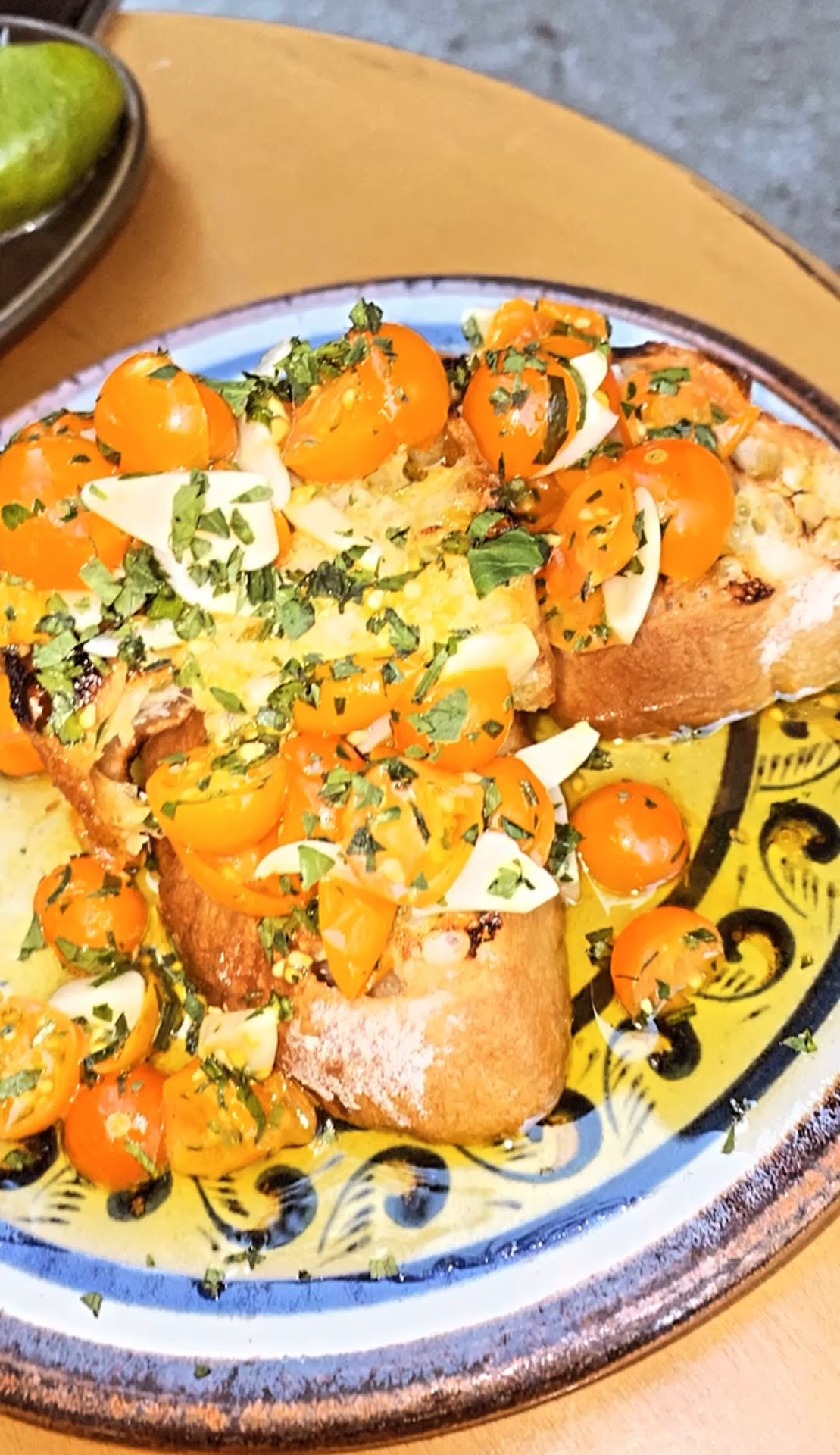 Toasted Bread with Cherry Tomatoes, Garlic Confit & Olive Oil – Sounds basic? Think again. This dish is a masterpiece of textures and flavors. The crunch of the bread, the slow-roasted garlic melting into every bite, the burst of sweetness from the tomatoes, and that luscious drizzle of olive oil—it’s next-level delicious.