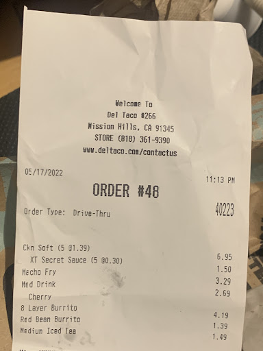 Read moreWe came here for an evening late night snack but to our dismay the drive-thru line took us 30 plus minutes. When we found out why we discovered that the gentleman working was the only gentleman working the line was all the way to the end of the parking lot of cars waiting to get their food the poor guy looks super stressed and out of breath he was nice but you could tell overworked management should really do something to get him some help. Now let's talk about the food the food was well let's say not the best not that Del Tacos the best so that means the food was the worst because of the long wait other than that you expect not so great food from Del Taco you just don't expect to wait 30 plus minutes. I would say visit the Del Taco that's on Sepulveda and Nordhoff they're much quicker and the food's always fresh other than that you guys have the rest of the beautiful weekend...