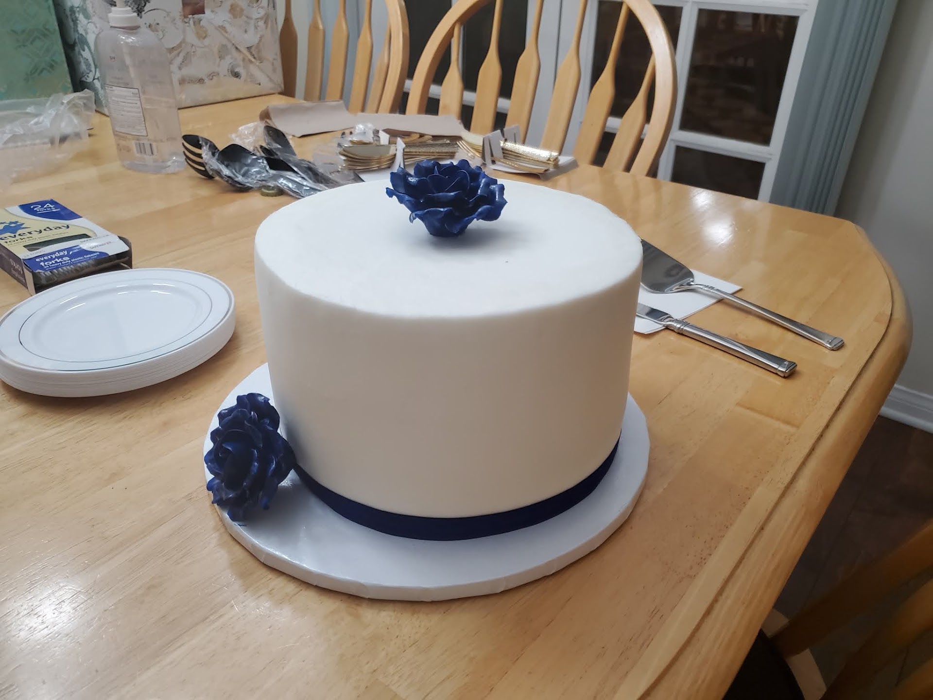 We had sent pictures of what we wanted and we got it! The only detail that was tweaked was that they had only 1 gum paste blue rose on the top, instead of 2, but actually it looked absolutely perfect. (I'll try to post pics below). I provided the ribbon and they did all the rest. We were able to pick up the cake easily afternoon before the wedding and Jan even emailed afterwards to double check that we had gotten the cake and had no issues. The other ladies at the bakery who we interacted with were always pleasant and professional as well.