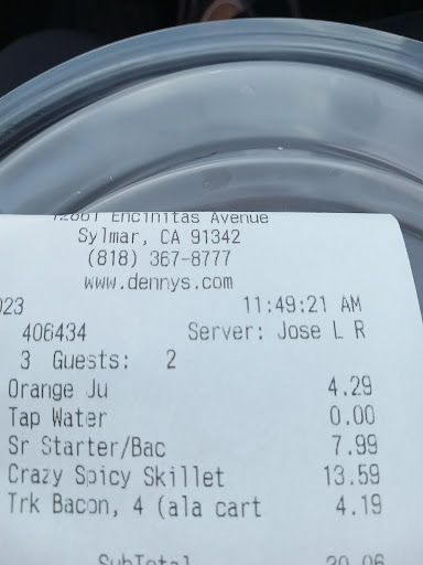 Read moreUnfortunately our car broke down in the parking lot but luckily for us the Denny's was here open Clean had a great atmosphere and very relaxing vibe there weren't a lot of guests so was totally chill everyone was super friendly and nice our waitress she was very nice as well she didn't go above and beyond but she did her job so that was perfect for us at this particular Moment In Time. I ordered the Grand Slam breakfast pancakes were hot fresh crispy to Perfection bacon was made the eggs were made excellent but the waitress forgot my hash browns that's okay again she was very nice about it she made no excuses and she said next time I should just double check orders so I like that because she took accountability for the mistake perfectly fine we all make mistakes and again she was nice. I'm giving it three stars because the apple crisp pie are apple pie crust as they call it is not an actual pie it's just apples with ice cream and a little caramel sauce drizzled so that was kind of a waste of money other than that the coffee was hot the breakfast was good the atmosphere was great and the people were nice. So warning if you come here please don't order the apple crisp pie thinking that it has crust because it did it and if it was supposed to ours definitely didn't have any which I'm pretty sure it was supposed to well let me know Ramble On It our tow truck drivers here you guys stay...