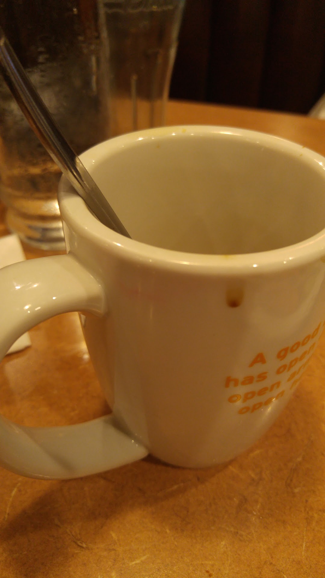 Food: Nope. A whole lot of NOPE and NOPE again. Later that day, I was sick as a pregnant woman in her 1st trimester. That was the ONLY food I had until dinner and I lived on the toilet for the majority of the day. The whole grain pancakes were not the business and I've had them before at another location. It felt very haphazardly thrown together instead of mixed throughly. The granola or oat crumbles were in the center of the pancake so it crunched and some parts were gummy. Pancakes shouldn't crunch. My eggs crunched a bit and I didn't finish them; the hashbrowns were slightly greasier than expected; and the apple juice was SYRUP CONCENTRATE. We order apple juice for our son but found out why he kept pawing at it before his food arrived. I took a sip and realized it was concentrate without enough water. I mixed it in all our water cups and we were able to share apple juice with the entire party. Mishaps happen, so be it. It's not a big deal but it's disappointing.
