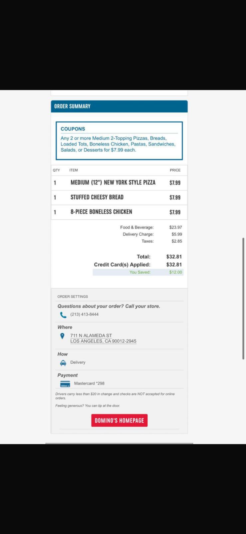 We ordered 1 12 inches New York style Pizza 🍕 $7:991Stuffed (and this What Domino’s Pizza did STUFFED Us and HQ ) cheesy Bread 🍞 $7:99 8 pieces of Boneless Chicken $7:99 $7:99X 3 plus Delivery $5:99 plus only in dishonest America they do not ADD TAXES TO ITEMS Presents have tried changing the LAW but lobbying continues LLC has stopped American people from getting the truth about what they are buying Taxes $2:85 total $32:82 cents and no pizza 🍕 delivery or bread 🥖 or chicken 🐓 delivery 🚚 payed for in full price and delivery 🚚 TXT store they said they delivered but on Phoning 8 times they denied delivery 🚚 or odder ever existed??? And you can ring HQ and they are of no help and I phoned ☎️☎️☎️☎️☎️☎️☎️🐓☎️📞📞📞📞📞📞📞📞📞they said they would refund the money but no refund or anything I asked to send me the FOOD BUT NO FOOD OR REFUND OF MONEY 💰 if I could give 0 Stars 🌟 for everything we would including Head Quarters Offices in CA only in America 🇺🇸 the people of America say ???? They are as useless as AT&T in America 🇺🇸 0 stars again the delivery address had CCTV and NO Delivery service 🚚 made 711 N Alameda St CA 90012 we even txt the same store they said they delivered but when you ring them they denied the order and delivery date had ever happened???? Should be called...