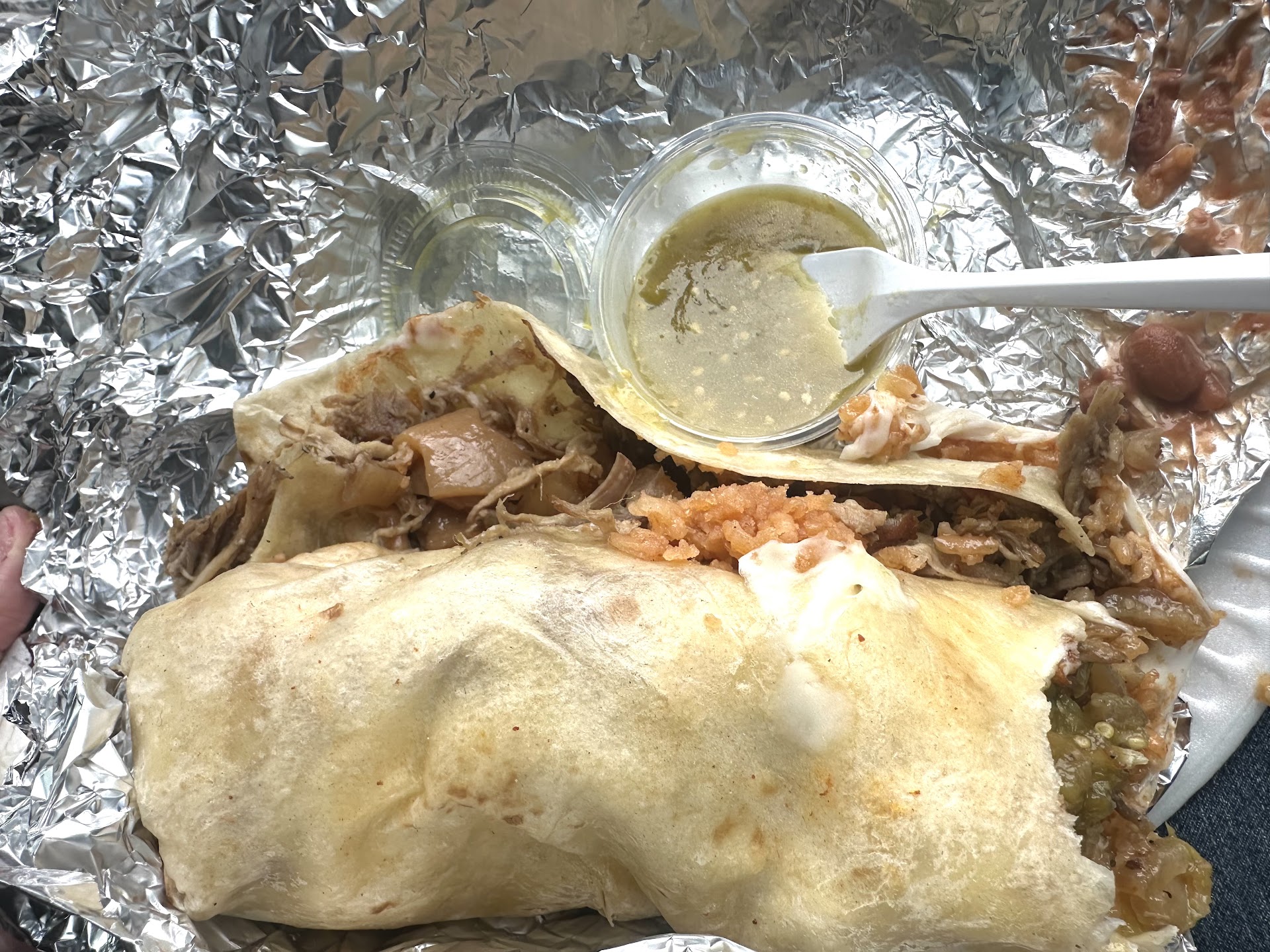 We also ordered the carnitas and cuerito burrito which came with rice and beans inside cheese extra. I loved their carnitas! So tender and flavorful and perfect with their green sauce. The burrito was $12 and it was the size of my head! It was so big I couldn’t hold it to eat it so had to use a fork lol