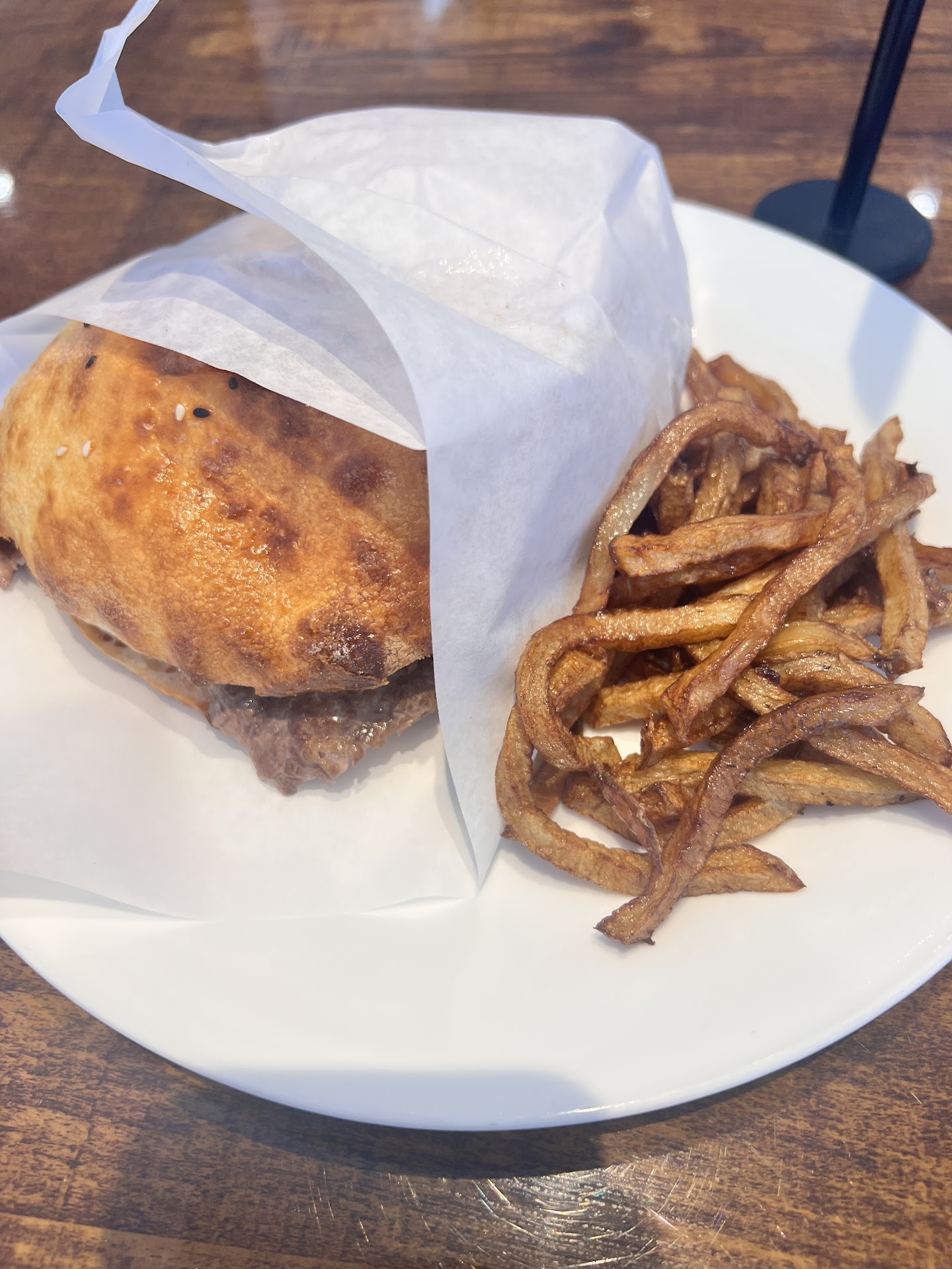 Food wise, I paid $18 after taxes and before tip for a sandwich and fries. You can’t really tell from the photo but the fries were super greasy, limp, unseasoned, and not even warm which is confusing because I don’t know how you get that combination. Usually deep fried = crispy. I might have eaten more of them because I was so hungry but every time I picked one up my hands were covered with oil and again I wasn’t offered any utensils.