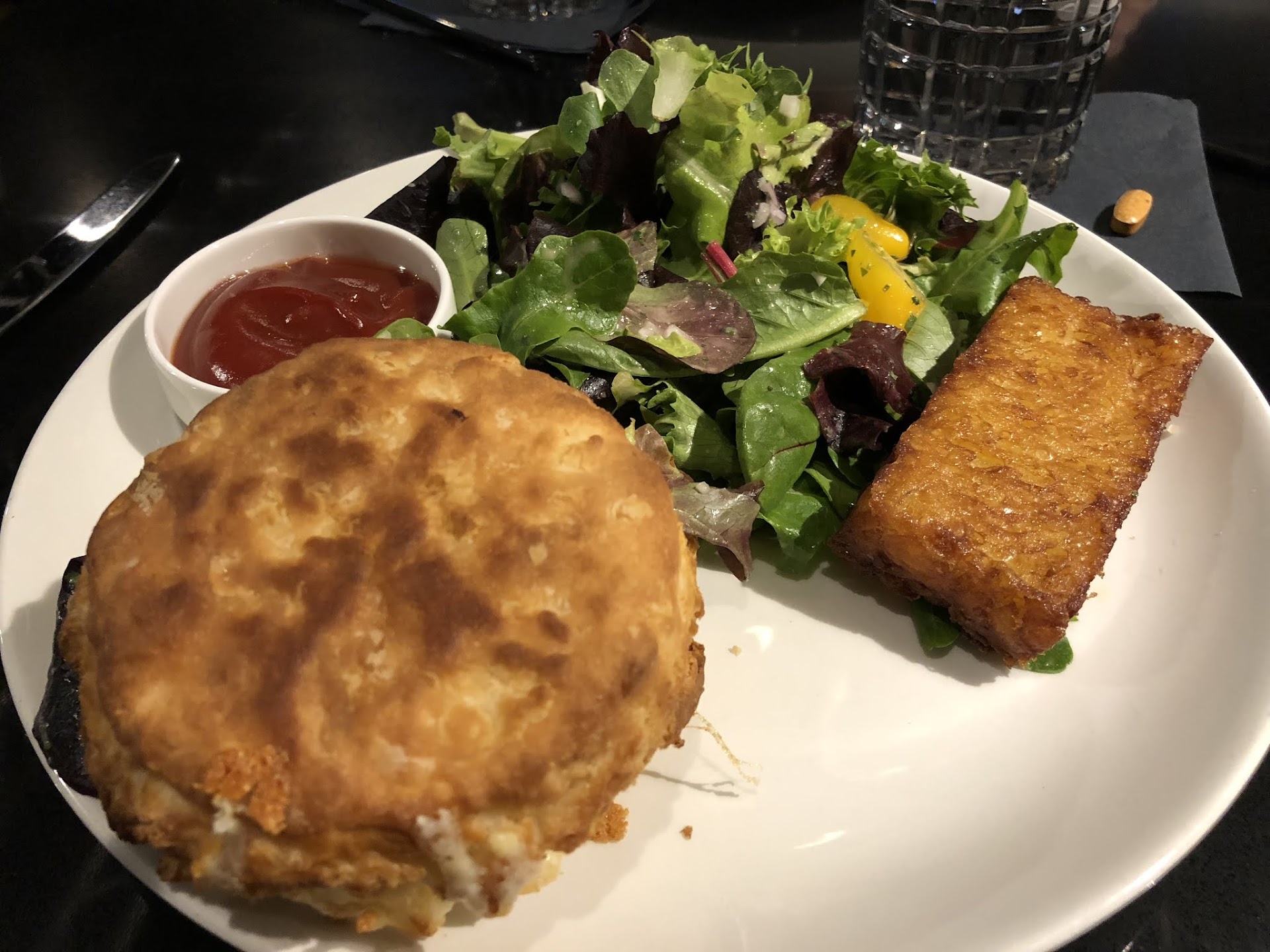 I had the egg sandwich choosing biscuit for the bread, with white cheddar cheese and no the sausage. It came with hash browns and a salad. The biscuit was perfectly crunchy on the outside and fine on the inside but seemed like it may have been reheated. (Am I the only one who has a sixth sense for when biscuits have been reheated?) It tasted good but the cheese needed more of a presence.