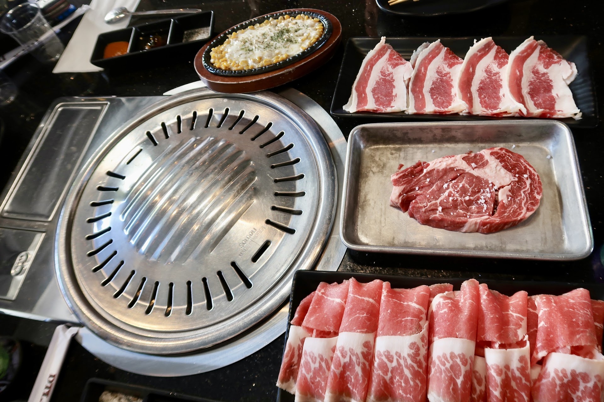 When we sat down, they provide us a house salad, macaroni and spicy tomato chip. They did not provide kimchi like other KBBQ no matter what level. I ordered fried calamari, rose ddukbokki, miso soup, seafood ramen, steamed egg and corn cheese as my snacks while I waited for the meat. Highly recommend ROSE DDUKBOKKI and CORN CHEESE especially the rose ddukbokki. It was hard to decried its sauce, um, like a rich, creamy spicy tomato sauce with butter. It contains sausage, rice cake, bacon and sheet jelly?(I guessed). Anyway, both my partner and me agreed it is delicious. Corn cheese is not only corn with cheese. We could felt that the restaurant add some favor inside and it is tasty. Other snacks are good too but not outstanding as rose ddukbokki. I was so sad that I could not order other snacks such as cup ramen fried rice, kimchi jjigae, Korean fried chicken bites etc.. I was too full to enjoy other snacks.