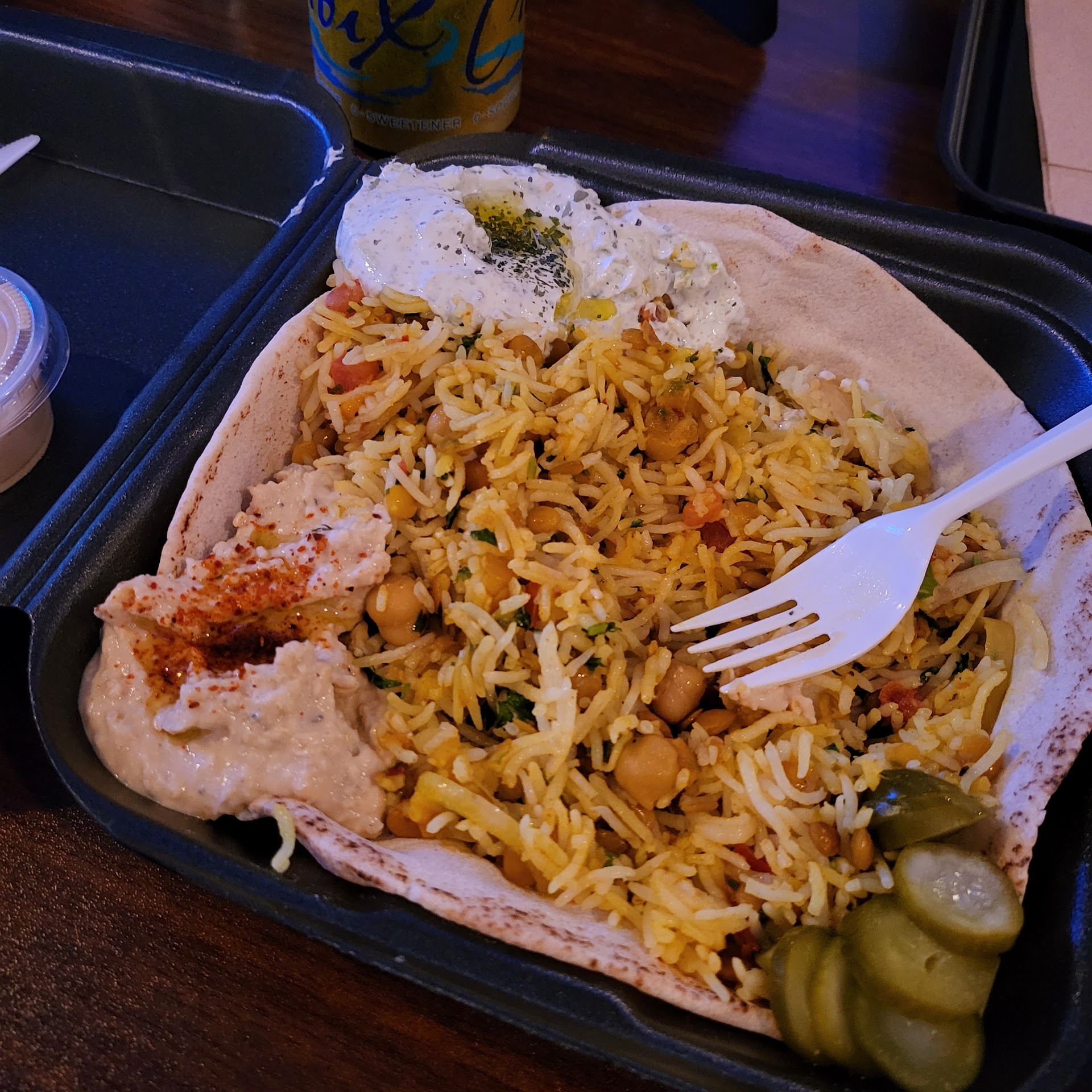 We were looking for a Mediterranean spot near us via Google maps search and I was surprised that I never noticed this spot before (we come to the Sprouts next door on occasion). So, the place doesn't stand out, but the reviews seemed reasonable, so off we went. Wow! The food presentation alone put a smile on my face (pic is after I had eaten some already). Happy to say that everything tasted just as wonderful - fresh, light, tasty. My husband was impressed with the tenderness and flavor of both the chicken and beef. He had the beef kabob with humus, for our 3 year old I ordered the kids chicken kebab with rice (thumbs up for having a kid's menu!), and I had one of their specials - lentil fried rice sans meat.