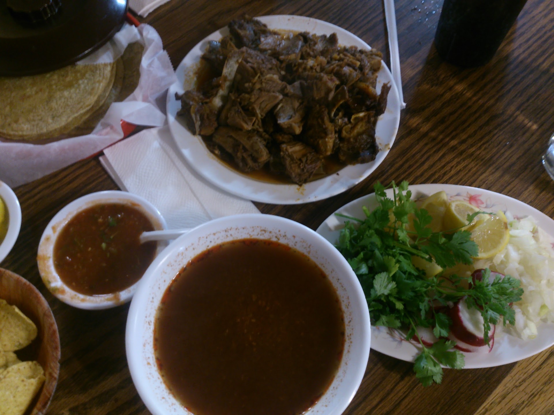The bírria is accompanied by a pile of cilantro, chopped onions, dried oregano, lime to enrich the broth. There is a pile of tortillas de maiz so I grabbed some of the meat, put in onions and cilantro to make my own Flauta.