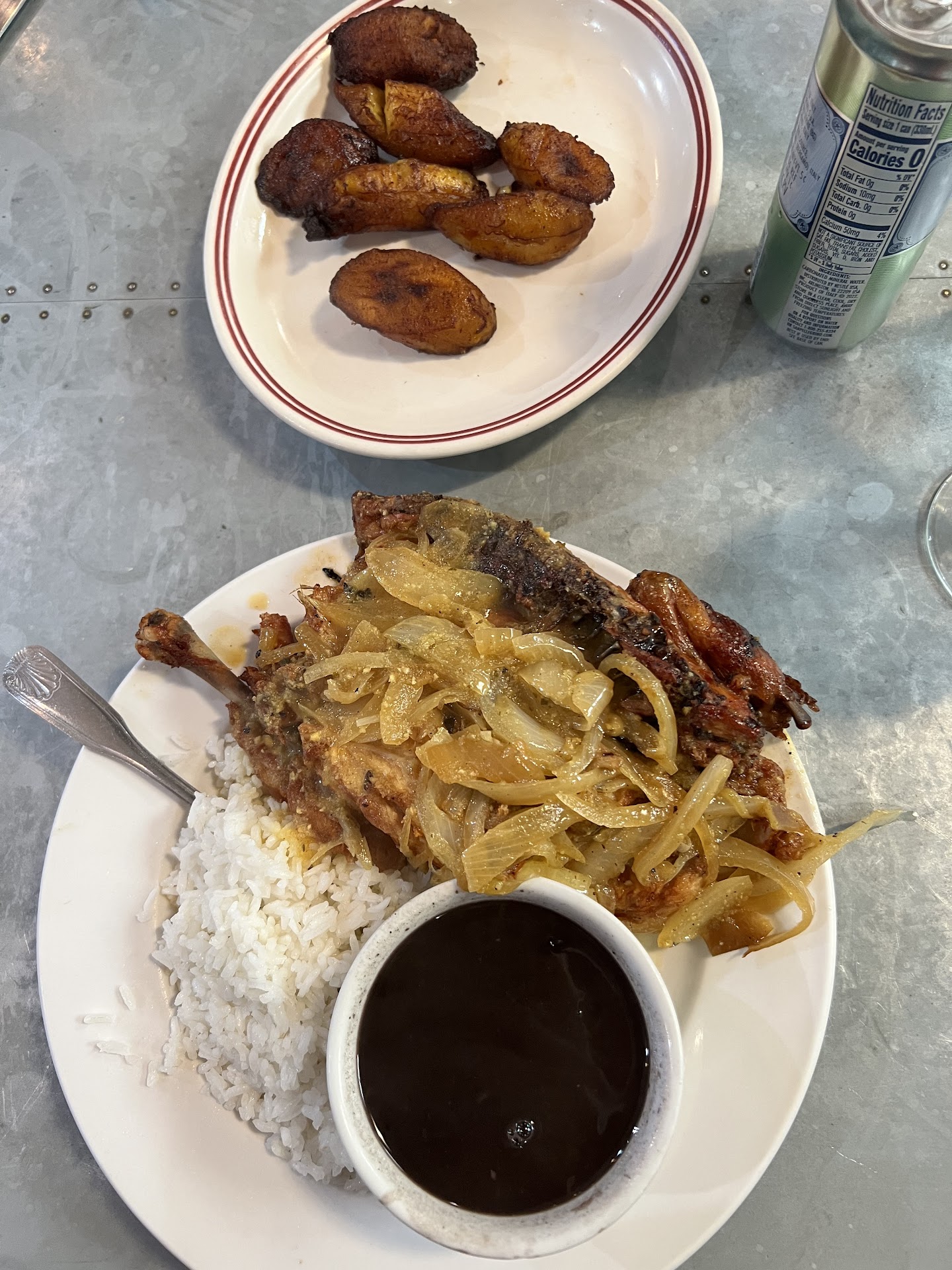 The lechon asada is fantastic! The pork is super tender and moist in the middle, yet crispy on the ends where the fat has fried. The onions are well cooked and have a bite to them instead of being slimy. The rice and black beans are exactly like my mom makes them: fluffy jasmine rice with smoky, tender beans in a thick sauce that comes from mashing some of the beans as they cook. This meal was by far my favorite as it celebrated traditional Cuban seasonings and cooking methods.
