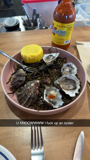 First off, my partner has a ton of food allergies, and the staff handled everything flawlessly. Huge points for that. We started with a half dozen oysters, fresh, cold, and perfect. They came with lemon, horseradish, mignonette, and (by request) a little hot sauce. Simple, classic, and delicious. The heirloom tomato salad was next, and it tasted like summer. Juicy tomatoes tossed in a vinaigrette that was just right—not too salty, not too acidic. Definitely grab a baguette and use it to soak up what’s left on the plate. The fig and eggplant dish was a standout. The smokiness of the fig with the creamy eggplant purée was such a good combo, unexpected and so good. Then came the halibut, cooked perfectly. It sat on a fresh herb purée that tied it all together. I just wanted a little more of that sauce because it was so good. We sat at the chef’s counter, which I highly recommend.