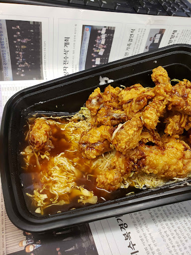 Today, due to a business matter, I stopped by on Wednesday around 12:30 PM. Strangely, the food was full of some kind of liquidโit wasnโt oil or water, but an unknown substance in which the chicken was soaking. The fried chicken had become soggy and lost its flavor, and the sauce had completely washed off.