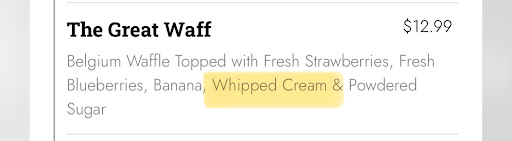 Then as I was going to enjoy “the great waff” that I also got, i noticed something immediately.. -no whip -a PINCH of powdered sugar -HOLES???? For a $13 waffle, you’d think they’d try harder. FOR A $50+ FOOD ORDER YOU WOULD THINK THEY’D DO A DECENT JOB.