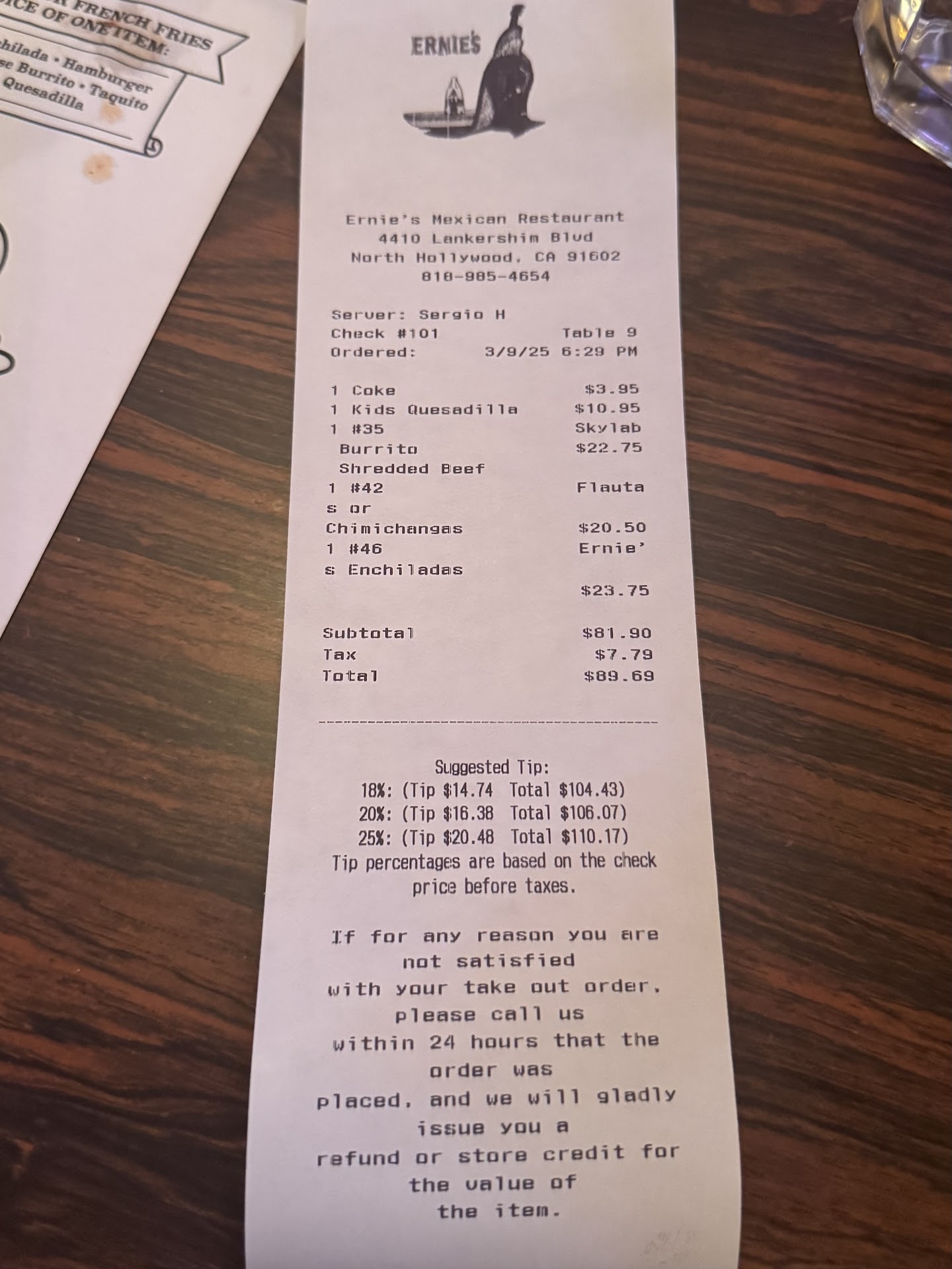 DO NOT GO TO ERNIE’S IN NORTH HOLLYWOOD!! I ordered a Dr. Pepper and it came flat and watery. I also ordered the cheese quesadilla which was $13 and my sister ordered the kids quesadilla which was $10. The kids were used with one tortilla while mine used two. Note that the manager said the quesadilla was “huge.” The fries that came with the kids meal weren’t cooked well and tasted like they put no effort into it. The rice and beans were alright but not worth $5. Service wasn’t good and just weird. The waiter I got was disrespectful. My sister wanted to order on the kids menu and our waiter walked away while we were ordering. A few minutes later, the manager came over to our table and said we wanted to talk to her about a problem. We didn’t know what she was talking about but later found out our waiter told the manager to tell us that my sister couldn’t order off the kids menu. He could’ve told us while we were ordering but he waited till after to tell the manager. I was also very confused why 5 different workers came up to our table to collect dishes or give chips and salsa. Overall Ernie’s is overpriced, food isn’t worth price, and has horrible service.