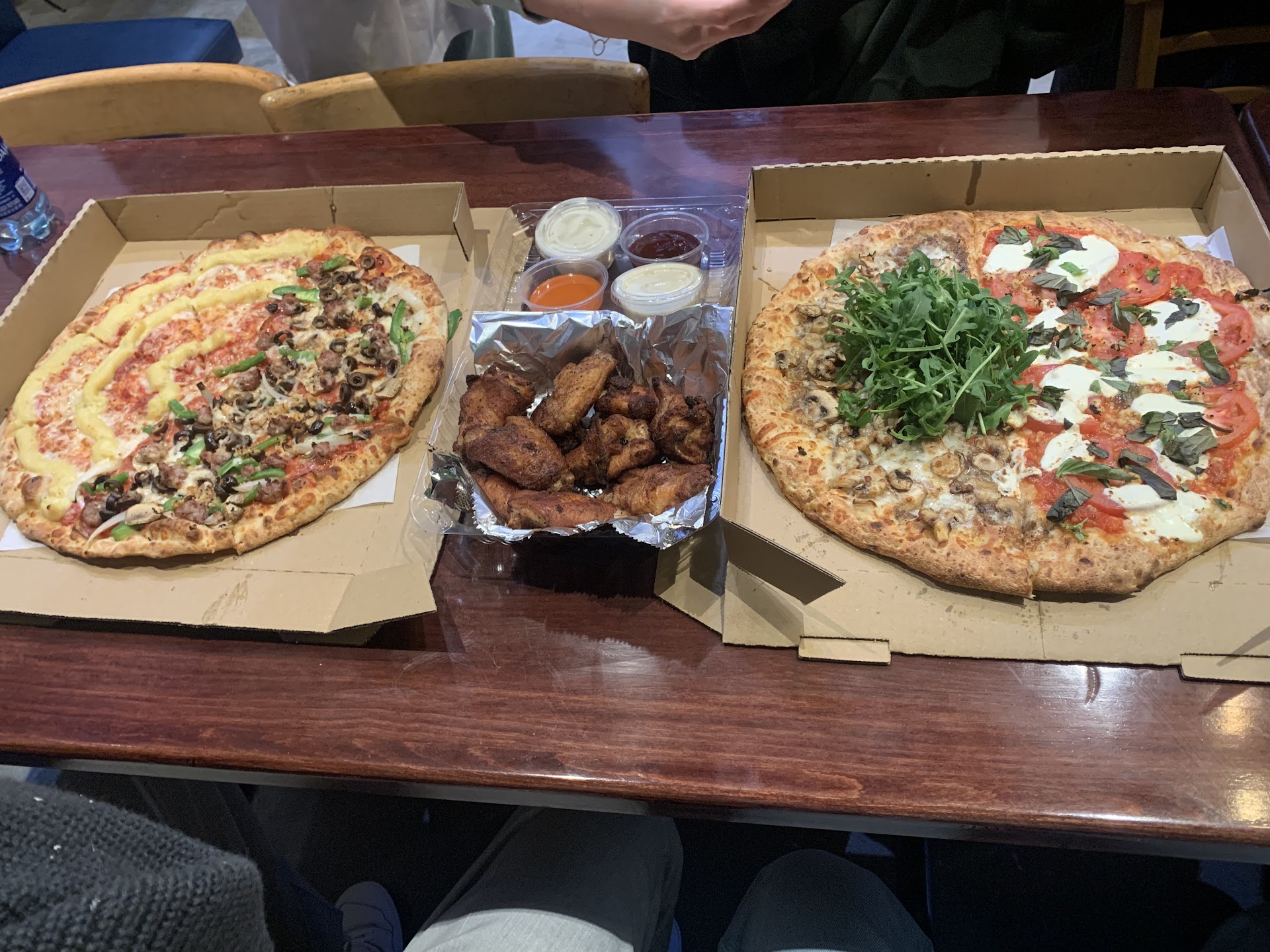 Fat Tomato Pizza is located conveniently in Koreatown and is the perfect spot for a group meal with friends (takeout/delivery too!). I love the option to do half and half pies! They make their dough in house (you can see it mixing behind the register) which is great, and all their food is baked if youโre trying to eat on the healthier side. Hereโs what we got: