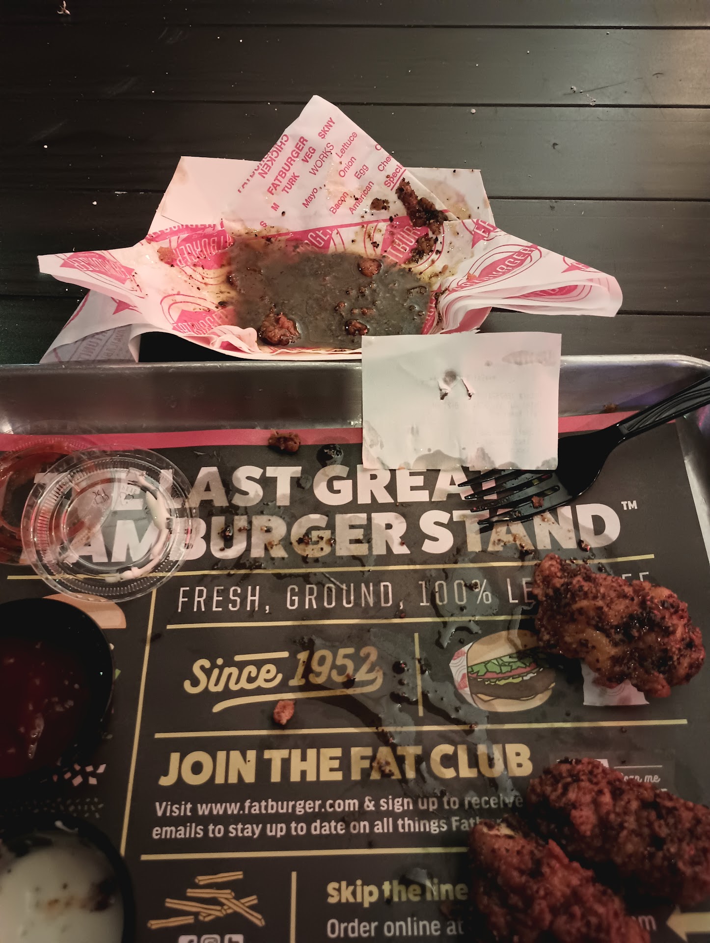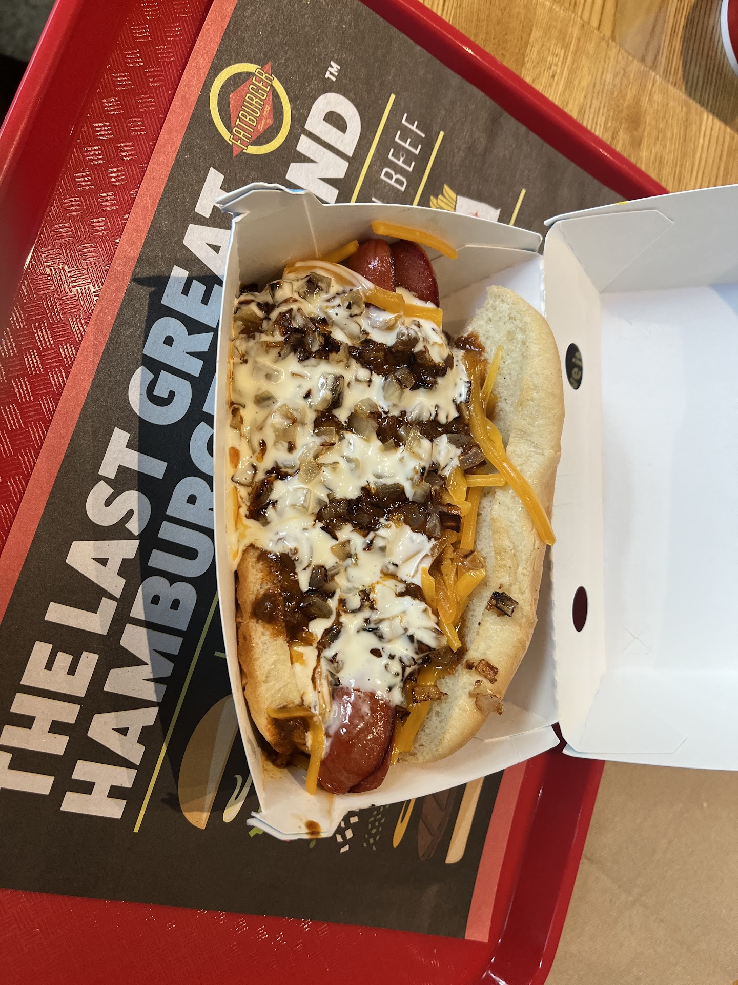 Read moreI had the chili cheese dog, my friends the crispy chicken burger. The taste of both were really good. The hotdog was juicy and topped with a lot of mayo, onions and cheese (you can decide by yourself what you want on the hotdog). The crispy chicken burger was huge! The meat had to be folded twice so it was possible to fit it in the buns. The meat was extremely juicy and the fried crust was crispy. The burger had mayo sauce in it, however you can decide what you want in it. I like Fatburger because a lot of things can be decided to be put on the products they offer....