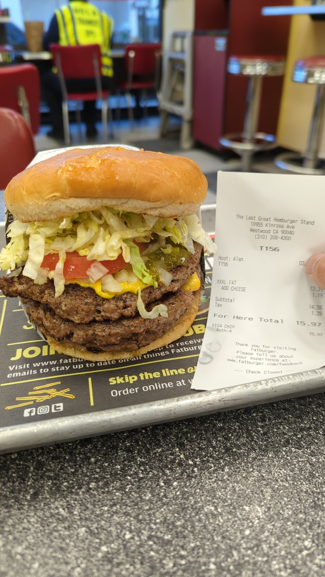 I don't often crave a burger but when I do... I always go to Fatburger in Westwood. It is super convenient. There is is always parking around and in the parking structures nearby. First thing, I walk in and the place is super clean and tidy. I very much appreciate a clean space. Second thing, the staff is super respectful and to the point. The manager Eddie answered all my questions about the food options. They even have impossible meat, which I love. They greet you, they take your order, and they make it pretty quickly. Thirdly, the best thing about this place is the main thing that matters....THE FOOD! The burgers are delicious! The Skinny burger comes with two juicy flavorful meat patties on each end instead of a bun.. you can choose whatever cheese you want and add on any extras. i like to add egg! It is a 10/10 here. And it is below 500 calories! The Turkey burger is also always a 10/10 here for me as well. The meat is lean but still tastes good and it isn't too greasy at all. The fat fries with seasoning so delicious. 9/10. One of my favorite things to order is the Oreo milkshake. It is to die for!! 10/10. This place is small but mighty... they cook your food with care like how they would want to eat it....they do not drown you in small talk which i love.. go in to a clean place...eat good food.. and go. No extra stuff.. I...