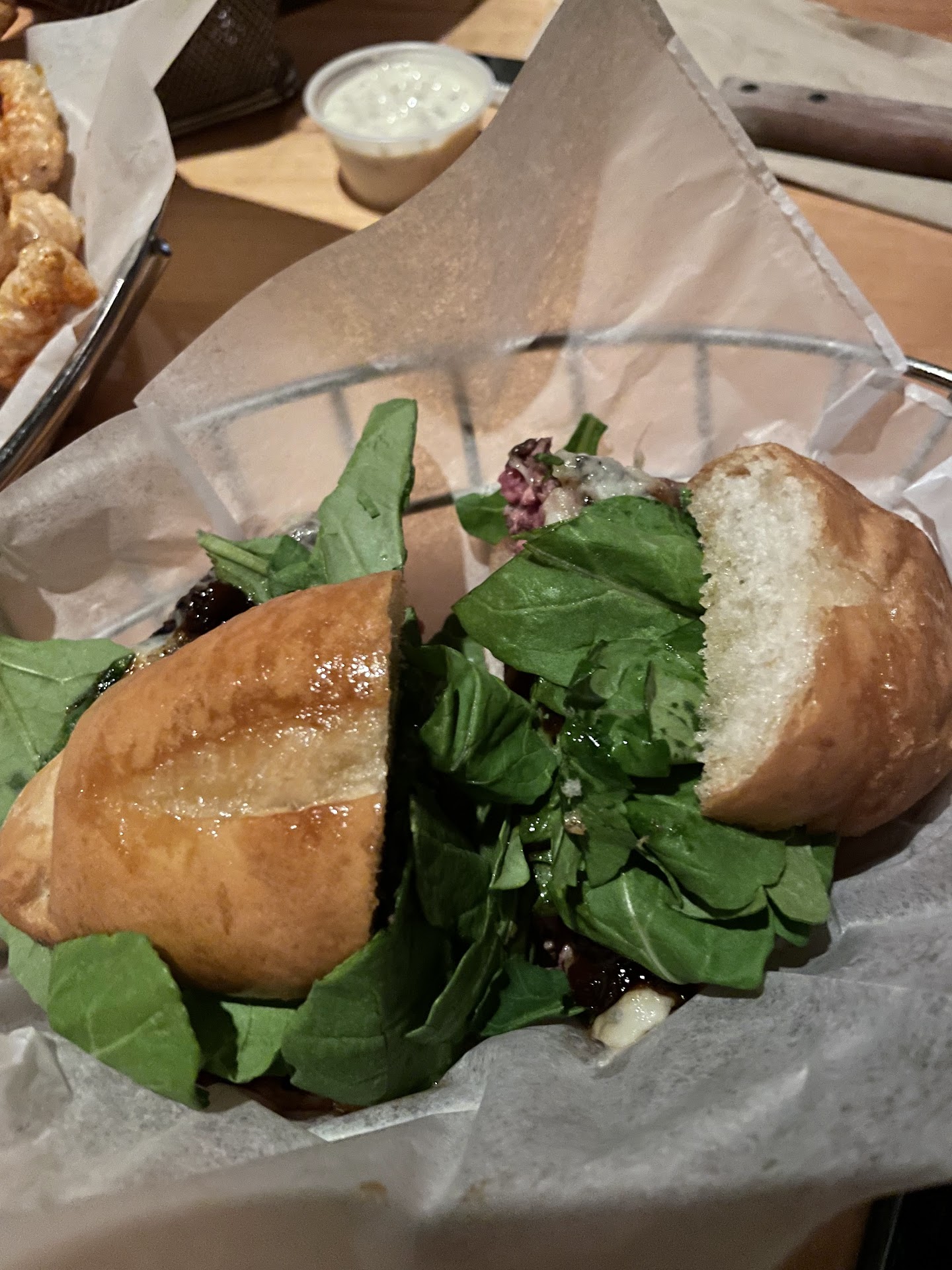 Read moreSo many people told me to try this place. I was shopping nextdoor with a friend and he asked the staff. 'where was a good place for lunch?' They recommended the hamburger. We met several other staff in our journey around the store and they all recommended the same place- Father's Office. So, we were starving and excited to try it. Walking in, we saw an amazing ing dish in a server's hand and immediately asked what it was- deviled eggs. We approached reception and were pointed street side and loved they had a lower garden area for dog parents. We had my friend's Yorkie with us so I found us a table while he went to order. I tried to find a chair that wasn't broken and a table that didn't wobble. Just about every chair was unraveled and, honestly, they were uncomfortable. The silver tables were dented and wobbled. I wanted to leave but my friend came out with a table flag and receipt. There were a lot of dog parents and the pets were calm and enjoying themselves. My friend upon seeing the condition of the tables and chairs went back to ask if we could sit at the tables on the porch or inside. She reluctantly agreed but even the concrete picnic tables were uncomfortable. He put the dog in the car and left it running g with AC on and we awaited this much anticipated food. The deviled eggs arrived first. He ate one and then asked me to try before making a comment. I nearly spit it out. So much pickle juice and a caper on top. I will never eat a deviled egg again. We pushed those to the side just as the buyers came. If you've not had a burger here, it is a surprise to get an oval bun with what appears to be Salisbury steak smothered in BBQ sauce and arugula. We each forced ourselves to eat half of our respective sandwiches. Neither of us like them. The flavors were all over the place and not harmonized at all. Lots of vinegar in the BBQ sauce echoed the deviled eggs we just passed on eating.