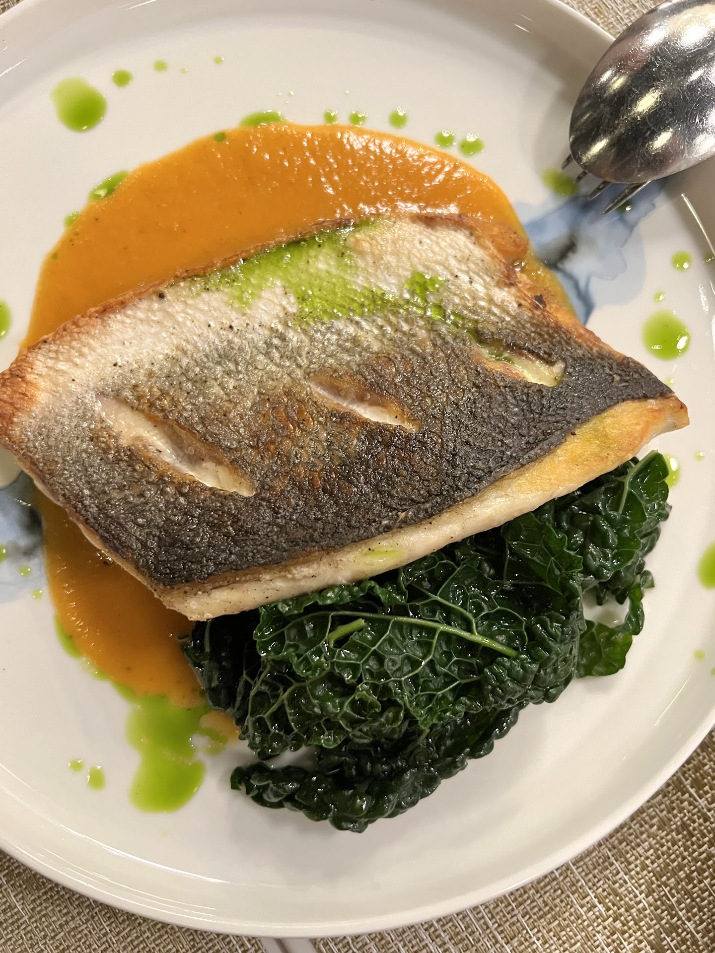 Sea Bass with kale: beautifully presented and executed. The fish was perfectly cooked â tender yet had a nice flaky/crispy skin. The kale was boiled to perfection, and the sauces were tasty. 10/10