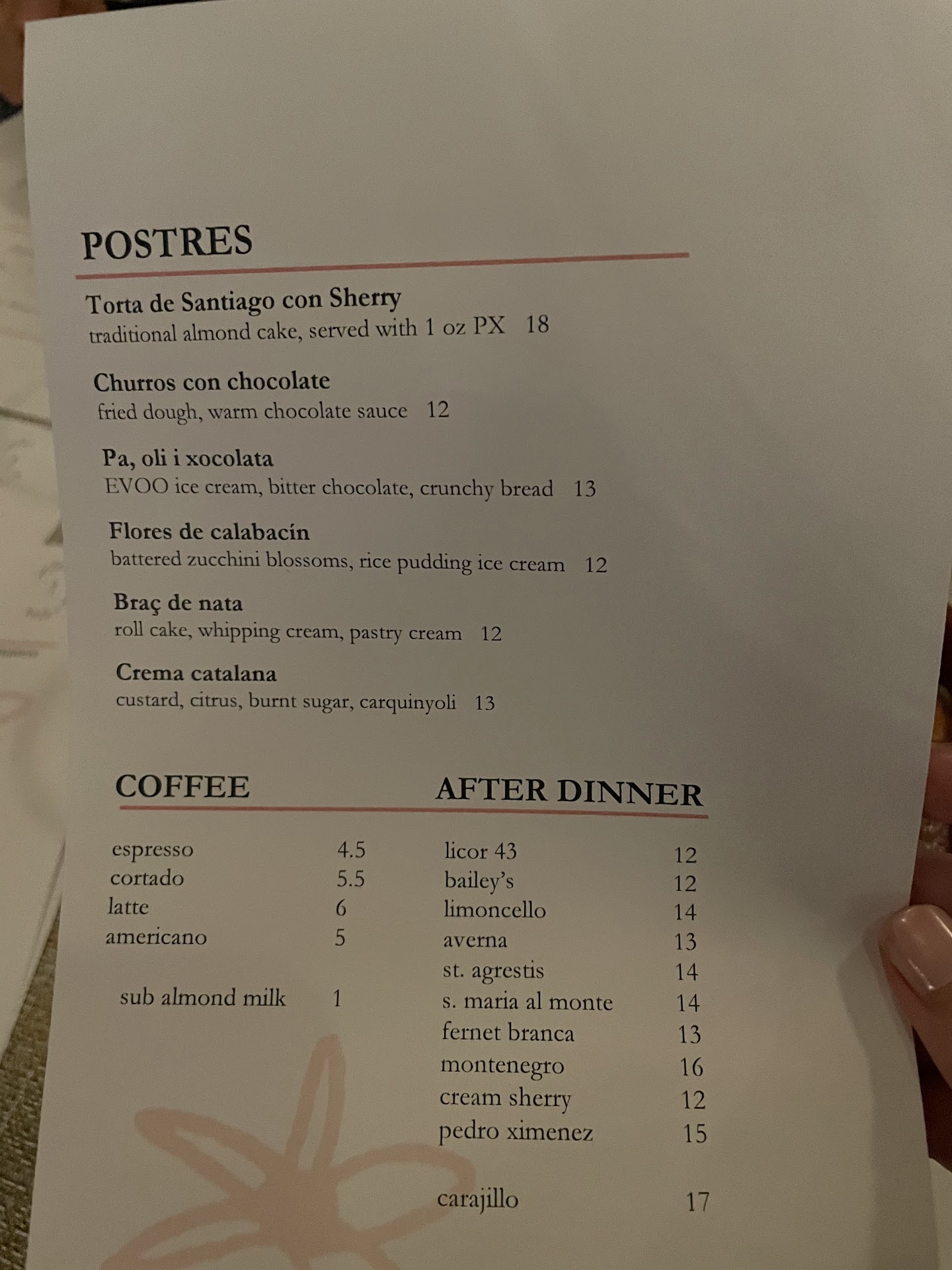 Read moreThis is going to be a slightly scathing second review for a restaurant that just opened (~1 week ago) but I don't see them remaining open without significant changes. We wanted to give the restaurant a try since we got to know Catalan cuisine last year and heard it was run by an engineer turned chef (that was my mistake, the restaurant is part of a restaurant group which made things worse in context). The best way to describe this is a way for rich people to "sample" an interpretation of a foreign cuisine (sample being generous given the portion sizes). The food wasn't authentic in the sense of ingredients, size, and love(?). I'm not going to criticize the staff, they were all very friendly and well enough informed given the proximity to opening (it's a fair assumption that many came from other restaurants in the group to support the opening). But the restaurant was poorly staffed overall; there was an excess of wait staff (there aren't that many tables) and a shortage of chefs (food took so long to come out that we didn't get "mains" until at least an hour and a half in) and there was only one bartender (we only got our drinks after all of the tapas has been served and after we ordered mains - that's an extremely poor experience). The food... The tapas were ok and priced decently but the portion sizes even up being a joke, maybe 1/3 to 1/4 of what you'd expect. This made sharing difficult (come on, the tapas!) and left us very unsatisfied. Spanish tapas are generally premade so it's easy to have variety with quick prep. The mains were disappointing, extremely over salted and disappointingly small (irrespective of price). Rice stuff was nearly incredible, chicken dish was a single thigh, soup was maybe a shot glass worth. I wouldn't say it was bad (aside from the rice dish and crema Catalan) but nothing memorable or worth returning for. Right, the desert. They might need a new Patissier. Of the three desserts we got, I'd only say the churros are worth getting. I've had much better but, eh. The crema Catalan should not have been served. Someone skipped the cooking class on mixing dairy with acids - they were trying to make it a crema Catalan instead of a creme brulee but they curdled the milk with the acid. So instead of a posting consistency it was that of a ricotta/goat cheese. Yeah, we didn't finish that. Overall, cocktails were decent but they need to get the service fixed with those, food was underwhelming in all respects, ambiance was nice, value was extremely poor. We were there over two hours for a meal that shouldn't have exceeded an hour by much. For a chef opening their own restaurant, many things could be excused (not those with the menu though) but for an established restaurant group, well, that's why you've...