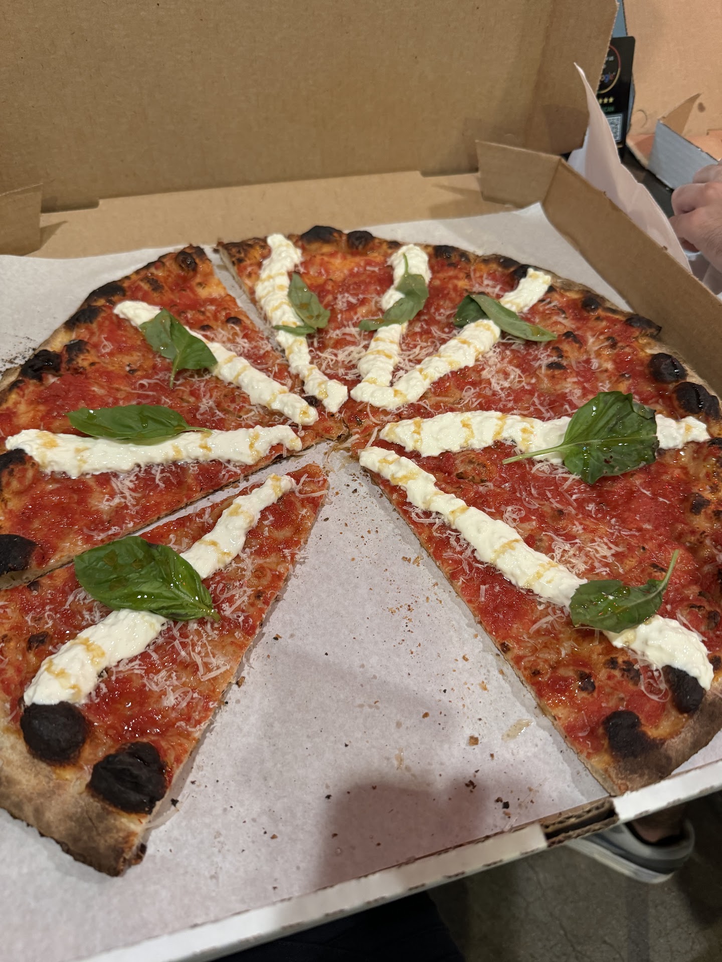 Read moreThis place WOULD'VE gotten 5 stars BUT..... Ok. Had a craving for " a slice". Sometimes you dont want the entire pie, you just gotta feed the craving. So, being an ex pat from N.Y., Brooklyn, in fact am no stranger to the best. And living in the O.C, Cortinas in Anaheim is my go to for as good as it gets in So Cal. Ok. So reviews were terrific and a nod to the bougie in Brentwood who gave it an enthusiastic " best in L.A." rating. Well....Got the meatlovers slice. Presentation nice: Generous slice w ample meats, cup peperoni, Italian ham, sausage nuggets, a sprinkling of parm, a fat basil leaf for looks and aroma, the crust a swollen fragrant slightly yeast-y perfectly charred chew. The sauce, though very scant was quite tasty. No dripping oil to be found. All very satisfying....EXCEPT.....no mootz ! There was not a speck, no blob, no hint of creamy white stretchy cheese to be found. It was as if they forgot THAT part. I was enjoying it however as a new thing, not foccacia, not really pizza, more like a sharing experience where one person eats the cheese off it and the other person goes for the sauced crust. Only thing is, it was just me eating it ( w the best company in the world, my amazing Daughter) but was my slice. Well, got to 2 inches from the top and flagged one of the very attentive enthusiastic staff behind the counter, to bring attention to the issue. Was told , well that's how we do it, and there isn't a whole lot if cheese near the top. Huh?! So manager came over. So nice. Said would u like to try another slice? And brought over a basic cheese. Well, ok. How could I refuse? Well, again, that same experience. Felt great in the hand. Smelled good. Ample sliver, bread sensational, basil leaf...sauce smelled great BUT again....no cheese! They said that's the way they do it in NY. NY style. Wll no. WAS NY "style", just not with N.Y substance....THE CHEESE PLEASE. Dtr got a salad, very overpriced basic chopped romaine w meh ( but ample) poached/ canned??? chicken and a bunch of chicken peas. Dressing tasty. I will be back but will bring a ball of mootz. The customer service was terrific. Also no seating outdoors but that's also a nod to NY. * hey bring on the cheese and your ratings and biz...