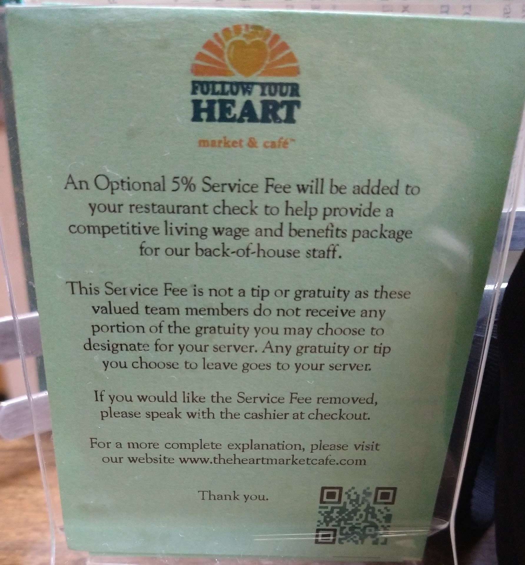 My 2nd issue is their new "Optional 5% Service Fee". Should they not also charge a utilities fee, insurance fee, and a toilet fee? I would rather they raise their menu prices by 5% than insult their patrons. To add a fee is blatantly advertising that they do not know how to pay employees a living wage. When I pay for my food, I am paying for the whole business - not separate sections of it. I e-mailed Follow Your Heart about this but they are silent. Maybe I need to pay a...