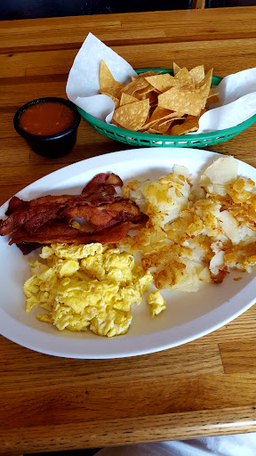She had a cheese omelet with mozzarella cheese, bacon and home fries. It had plenty of home fries, plenty of bacon, and she enjoyed it. I had a veggie burrito. It was excellent. It was pretty big. The main suggestion that I have for Frank's is that they change their salsa from the highly liquid salsa that they give out with the corn chips, and that drips down onto my shirt every time I eat the chips with that liquid salsa, to virtually any other salsa recipe that wouldn't drip onto their customers' shirts or blouses.
