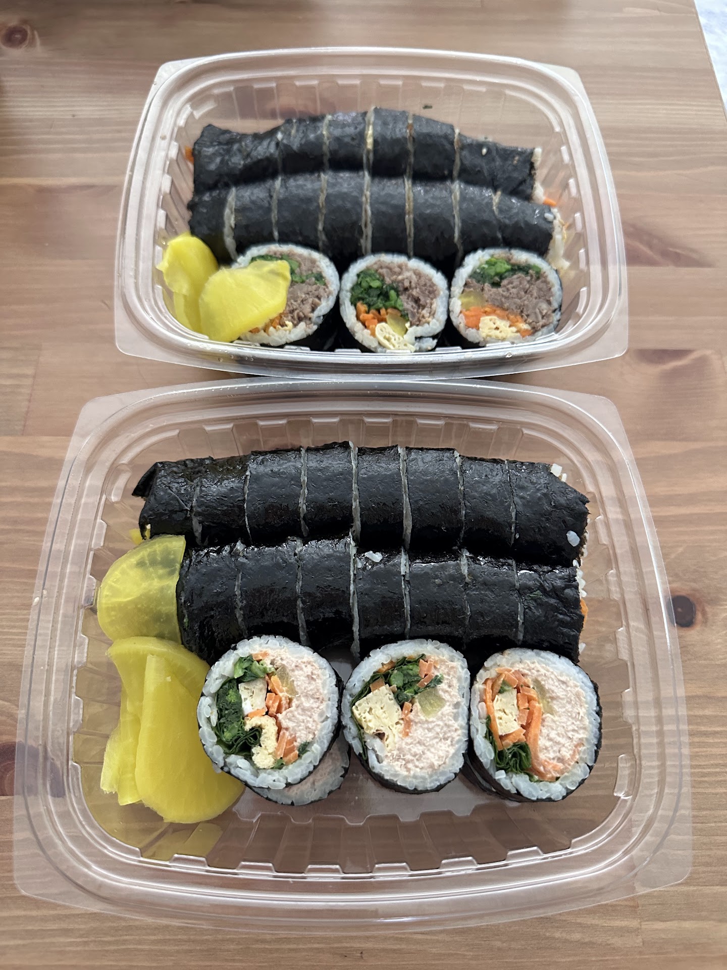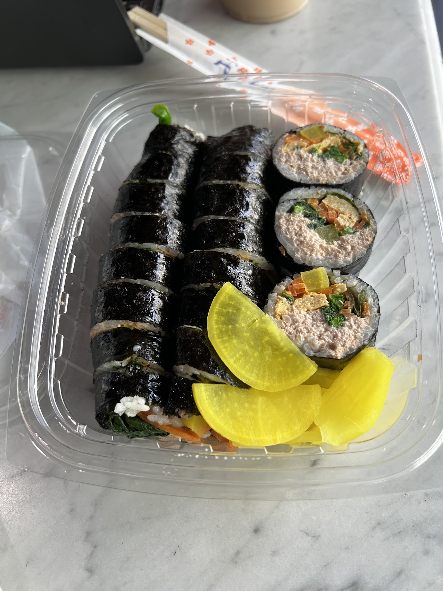 The service, or lack thereof. As a Korean I'm acutely familiar with and am fully immersed in the culture. However, this was just not it. The cashiers were having some issues with the person checking out just before me with their card or something, and the issue seemed to go on for well around 10 or so minutes. I wasn't in a rush for anything and although I saw my food ready I didn't want to bother them. One of the ladies (one who wears her glasses all the way down the bridge of her nose) then looked at the order sheet multiple times and seemed to go back and fourth with adding and then removing the kimbaps. But I figured they probably had a whole system and knew what they were doing so I just waited until they were ready. She then called up my number and I just verified that this was the 4 kimbaps and 1 noodle I ordered. I asked because they were split into two containers and one singular roll, so I wanted to make sure there wasn't one missing or something. She then got quite short with me, then said in a rather sharp and purposefully slowed voice "do you see this one, this one, and this one? huh? they're all in here, jeez!". I was taken aback but having seen the card altercation they had 10 minutes prior I decided to give her the benefit of the doubt, thanked her for verifying, and requested 5 pairs of chopsticks (we ordered enough for 5 people and were going to share).